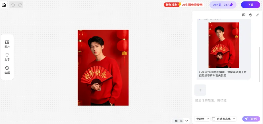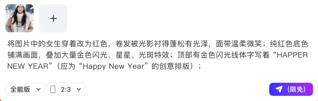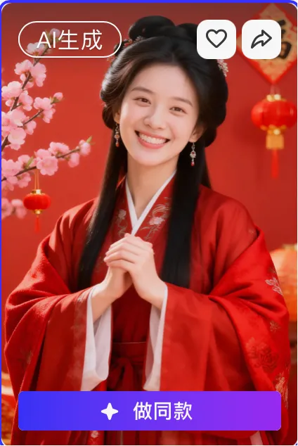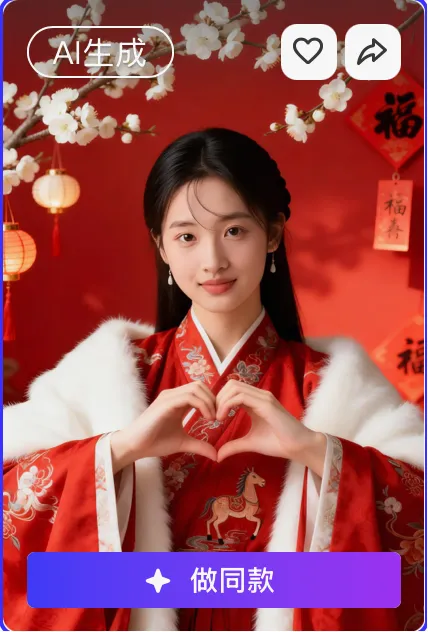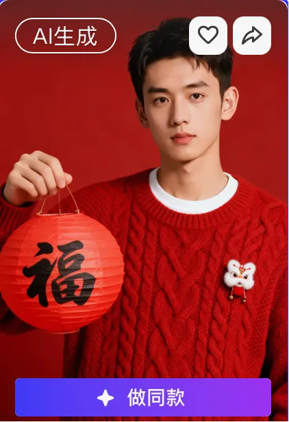 可以直接在提示词中加入你喜欢的个性化元素,AI就能一键生成好看的新年写真。