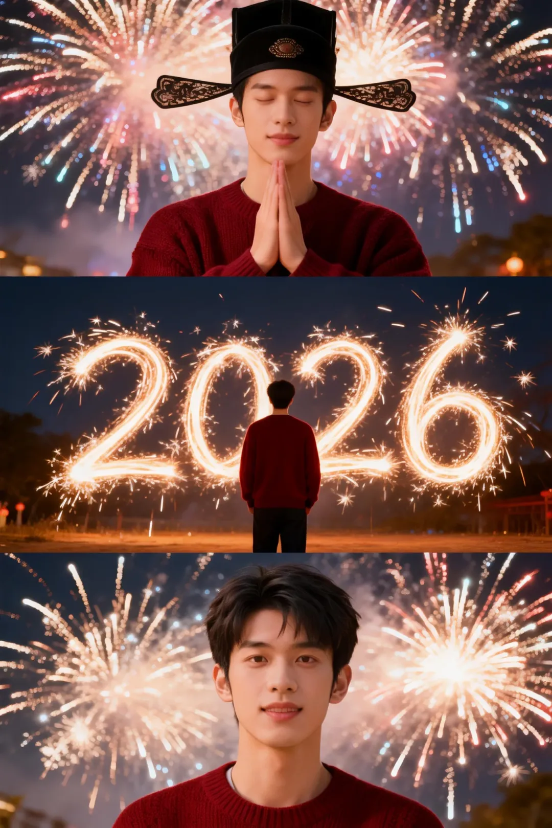这是一幅2026新年主题的三宫格海报,整体氛围温馨又充满节日感:由三张图纵向拼接而成,主角是穿酒红毛衣的图片中的男生。