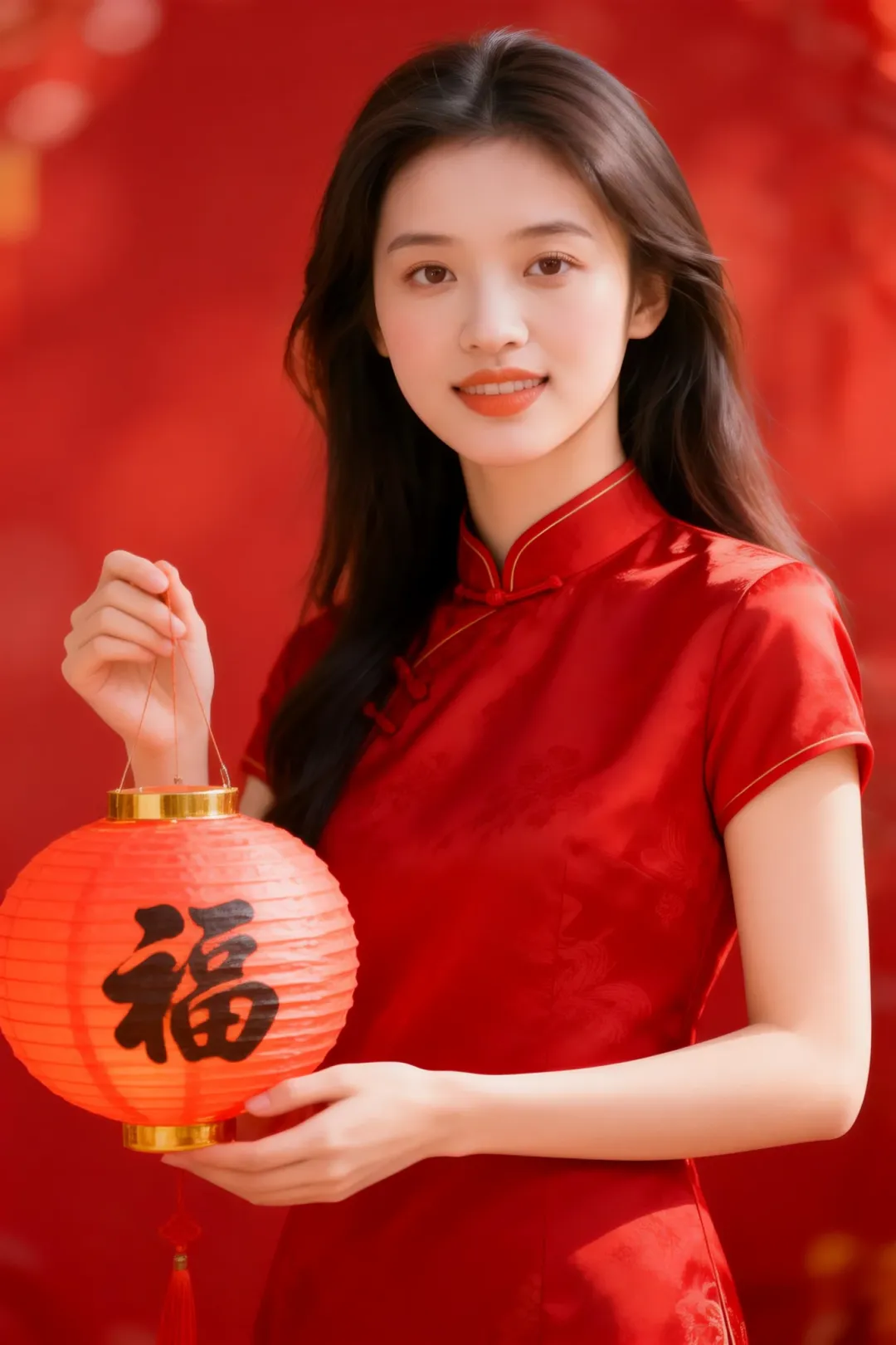 美女马年春节,喜庆写真,人物正面看着镜头,穿着传统红色旗袍,面带微笑,自然好看,手拿福灯笼,背景红色朦朦胧胧,真实摄影拍摄,光线清晰明亮,新年气息浓郁!高清面部。