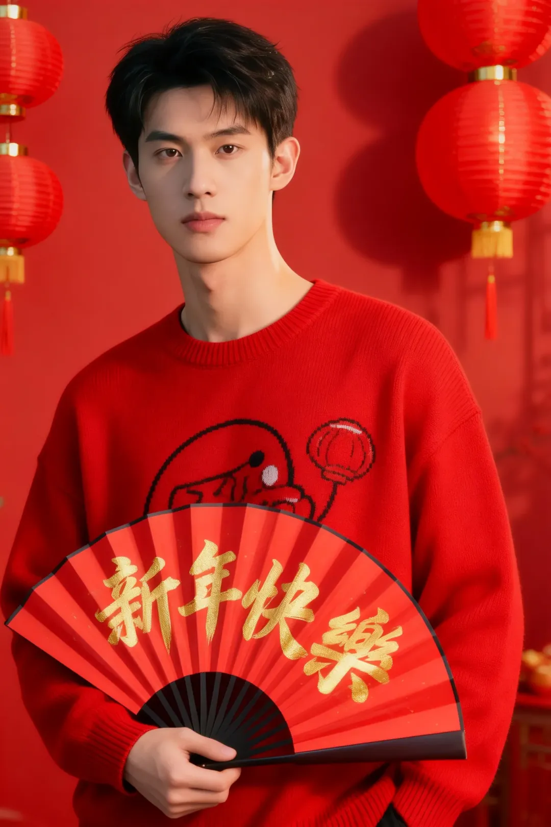 根据图片中的年轻男子,黑色短发,穿着红色休闲毛衣(印有简约图案);手持写有金色字体“新年快乐”的红色折扇;背景是红色墙面,有红色灯笼装饰,整体风格喜庆活力,充满新春拜年的氛围感。