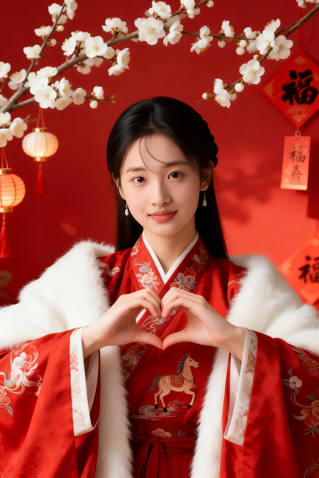 马年春节,气质美女喜庆写真,人物正面看着镜头,身穿传统纹样红色汉服,双手做比心状,白色毛绒披肩,简单耳饰,简单盘发,表情微笑,自然好看!真实摄影拍摄,光线清晰明亮,背景红色暖色调,并有简单的白色梅花枝,小灯笼,福字装饰!新年气息浓郁!32K高清面部细节,相似度百分之百。
