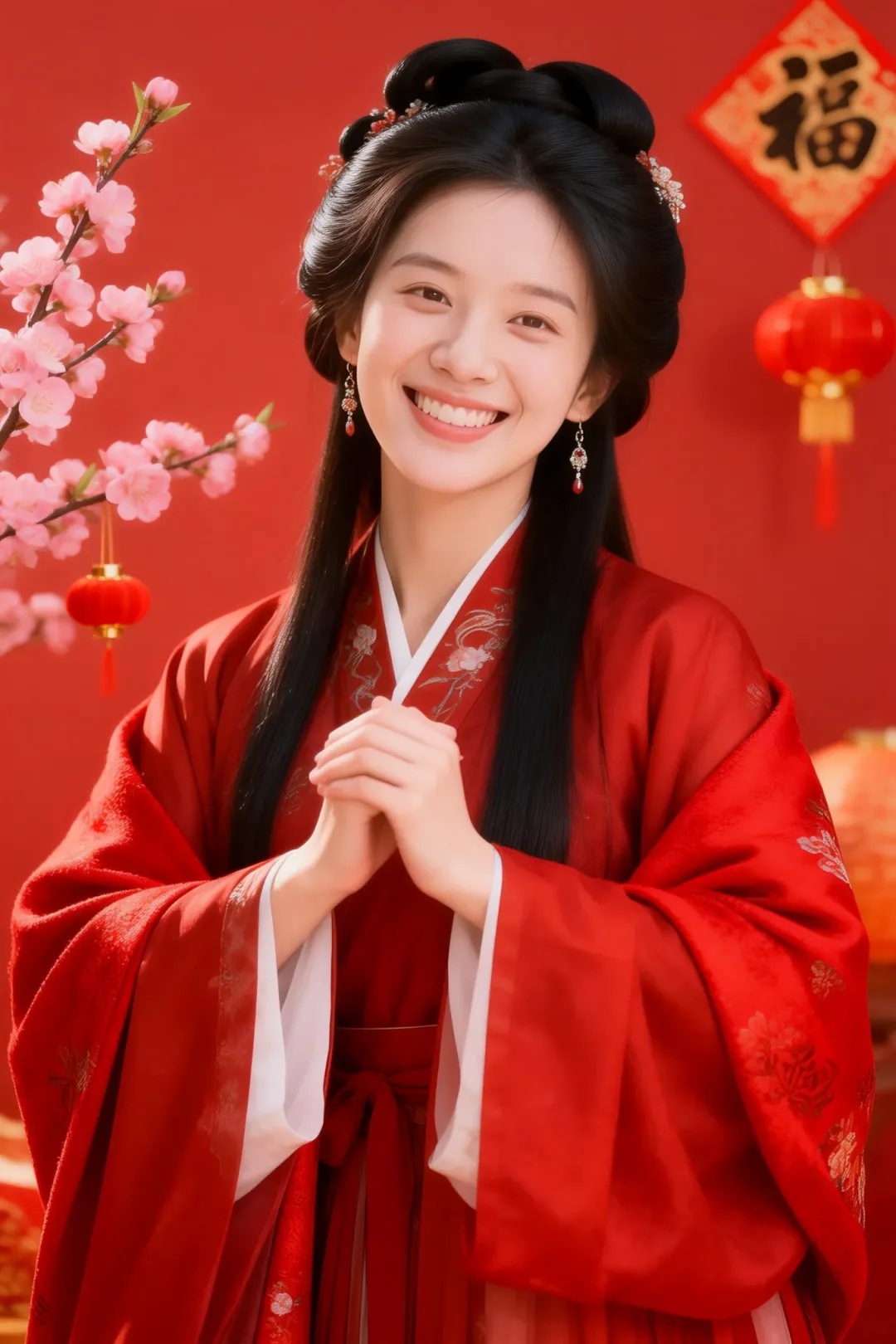 马年春节,喜庆写真,人物正面看着镜头,身穿传统红色汉服禾服,拜年姿势,红色喜庆披肩,耳饰,精美盘发,表情微笑,自然好看!真实摄影拍摄,光线清晰明亮,背景红色暖色调,并有简单的粉色花枝,挂有小灯笼,福字装饰!新年气息浓郁!32K高清面部细节