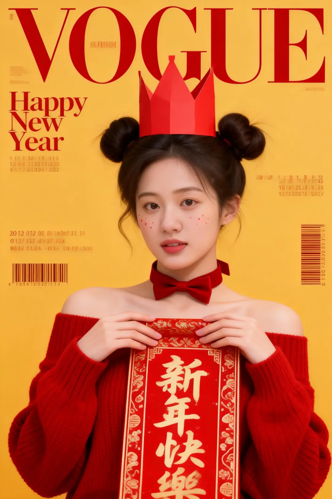 手中捧着红底金纹的“新年快乐”卷轴。采用暖黄色底色,顶部有大号红色 “VOGUE”字样,周围还点缀了“Happy New Year”“数字编码”“条形码”等杂志风格元素。