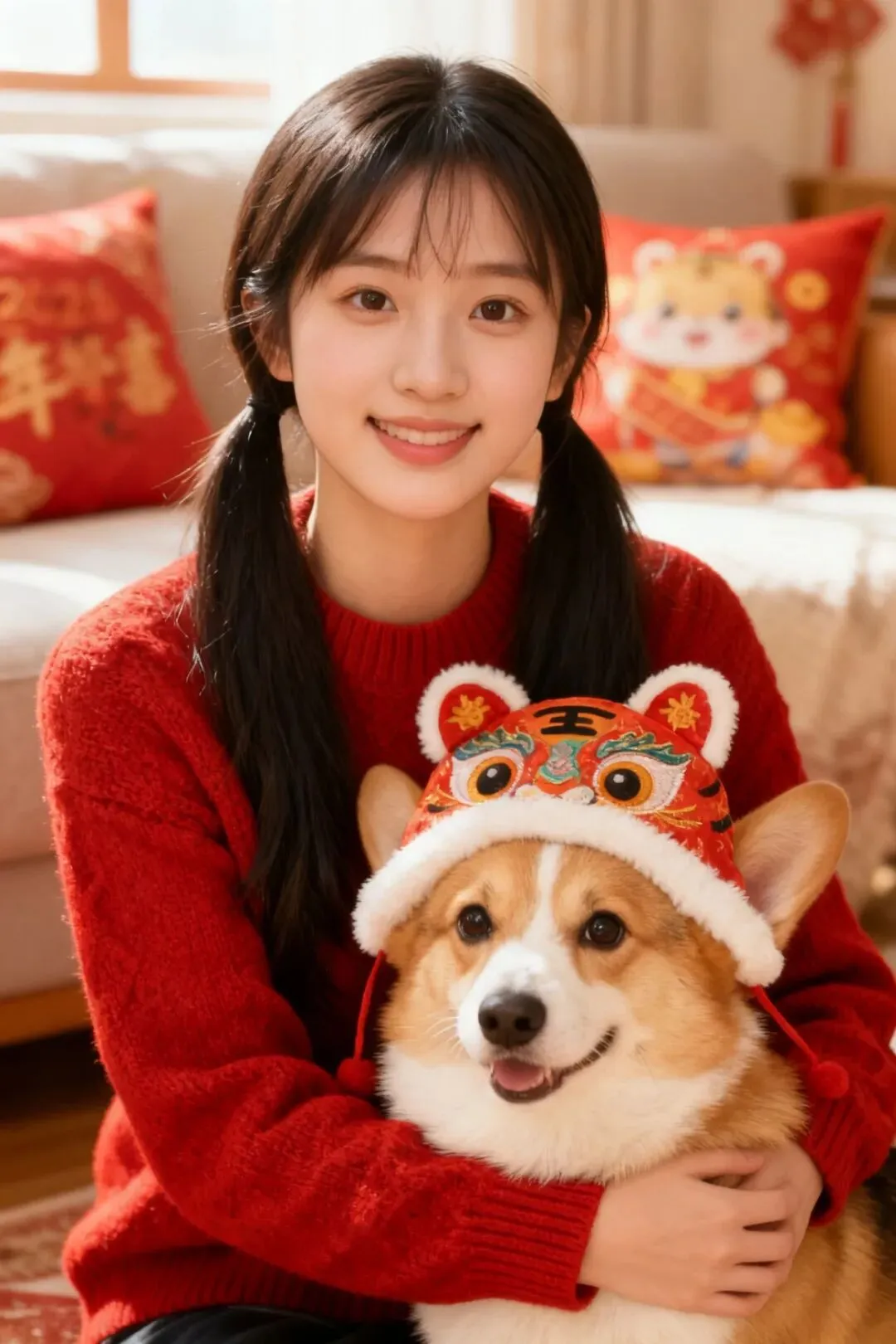 2026新年人宠写真,女生,红色毛衣+双马尾,抱着戴虎头帽的柯基,温馨客厅(新年抱枕),一起看镜头笑,暖调光影,毛发清晰,治愈感,高清写实