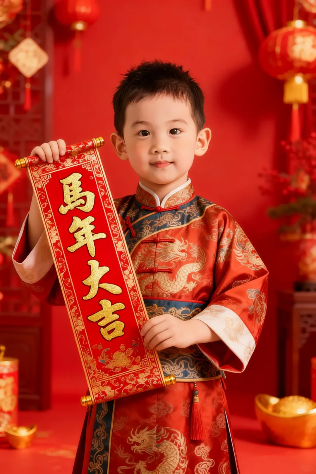 儿童摄影,写真,节日氛围,红色喜庆氛围,新年,古风装扮,唐服,双手拿着对联,左手金色大字“马年大吉”。