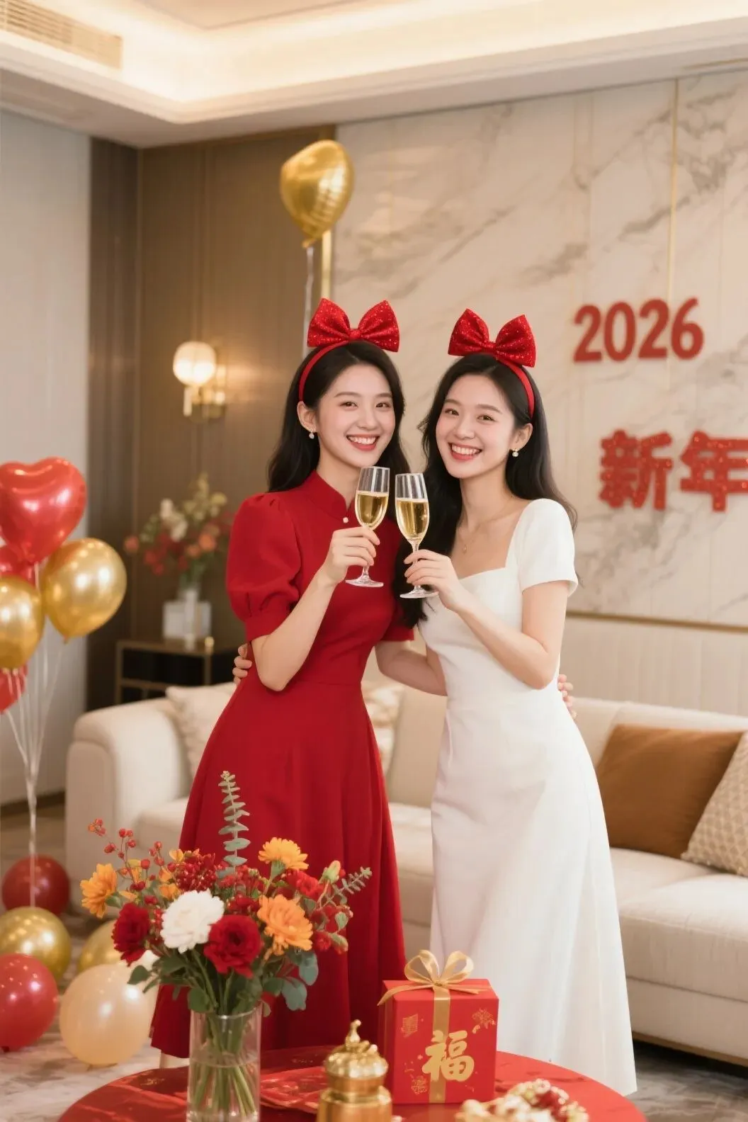 2026新年闺蜜写真,两位女生,一位穿红色连衣裙,一位穿白色连衣裙,头戴红色蝴蝶结发箍,手持香槟杯碰杯,背景是轻奢风客厅,摆着新年花艺和气球,笑容灿烂,氛围感甜美,高清,时尚感。