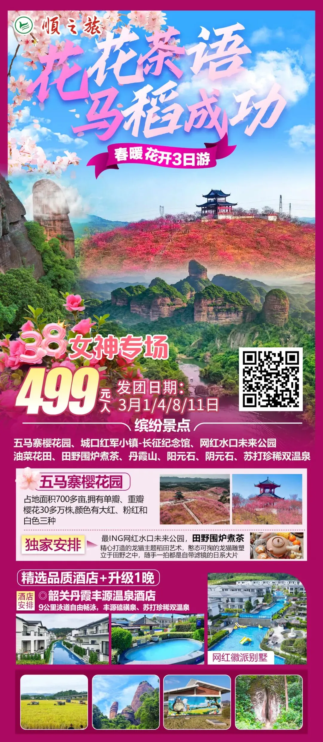 女神节专享¥499韶关樱花温泉纯玩三天!打卡樱花林&油菜花田、围炉煮茶,登丹霞赏奇石,泡珍稀双料温泉,入住网红泳道别墅酒店!