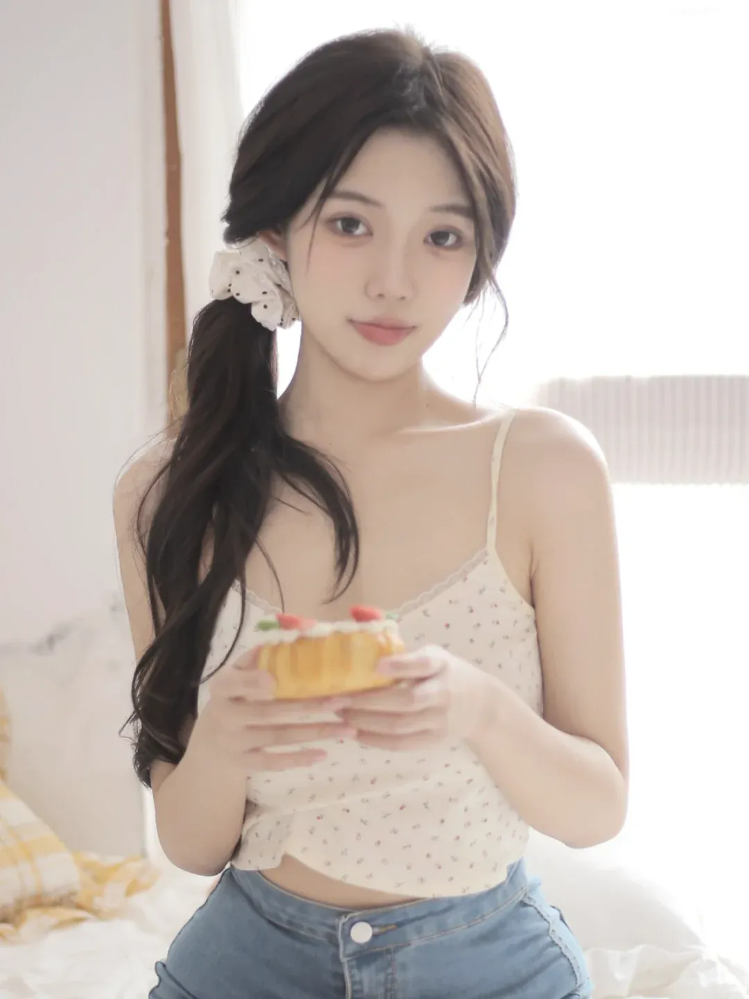 正地坐在床上,双手捧着小蛋糕,身体微微前倾,微笑着看镜头,就像在与镜头前的你分享这份甜蜜。拍摄时采用平视顺光拍摄,让面部光线均匀,突出皮肤的清透质感,整个画面充满了治愈的能量,温柔又美好。