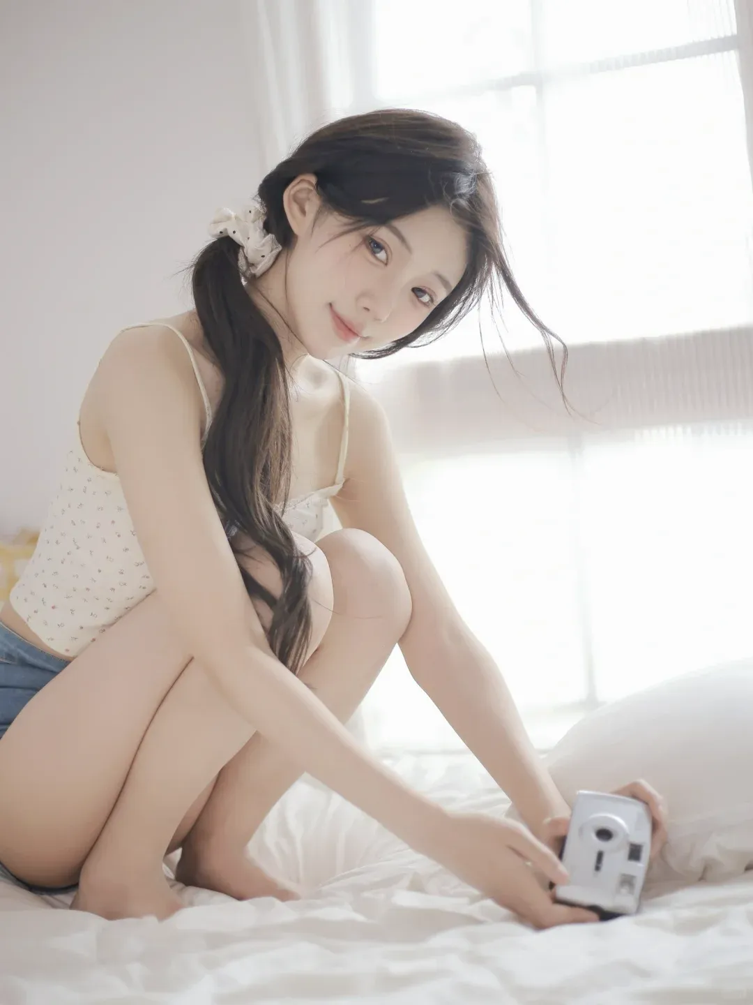蹲在床上,双手捧着相机对着镜头,身体侧转看镜头。这个姿势像是在抓拍人物自拍的瞬间,充满了互动感。拍摄时低角度仰拍,可以拉长人物的腿部线条,显得更加纤细。