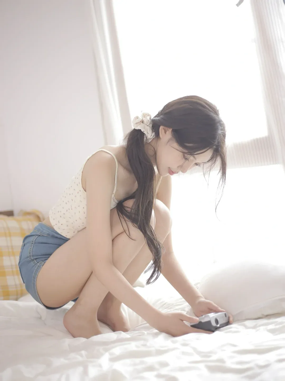 蹲在床上,身体微微前倾,低头双手捧着相机玩,就像是在浏览刚拍下的照片。这个姿势充满了生活化的互动感,看照片的动作让画面充满了故事性,松弛又自然。拍摄时采用平视角度拍摄,画面会更具亲和力,虚化背后的白纱帘,突出人物主体的同时,营造出一定的朦胧感。