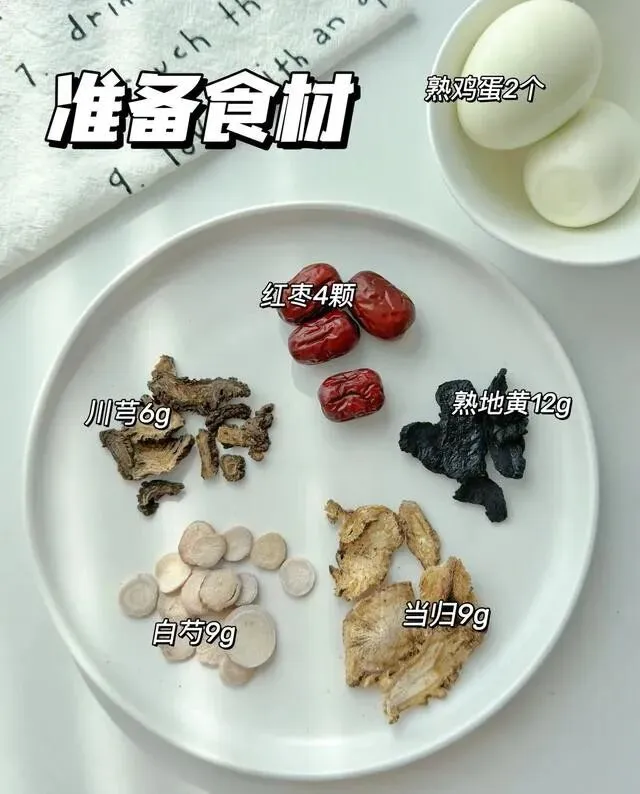 熟地黄12克 , 当归9克 , 川穹6克 , 白芍9克 , 去核红枣4颗 , 熟鸡蛋2个。
