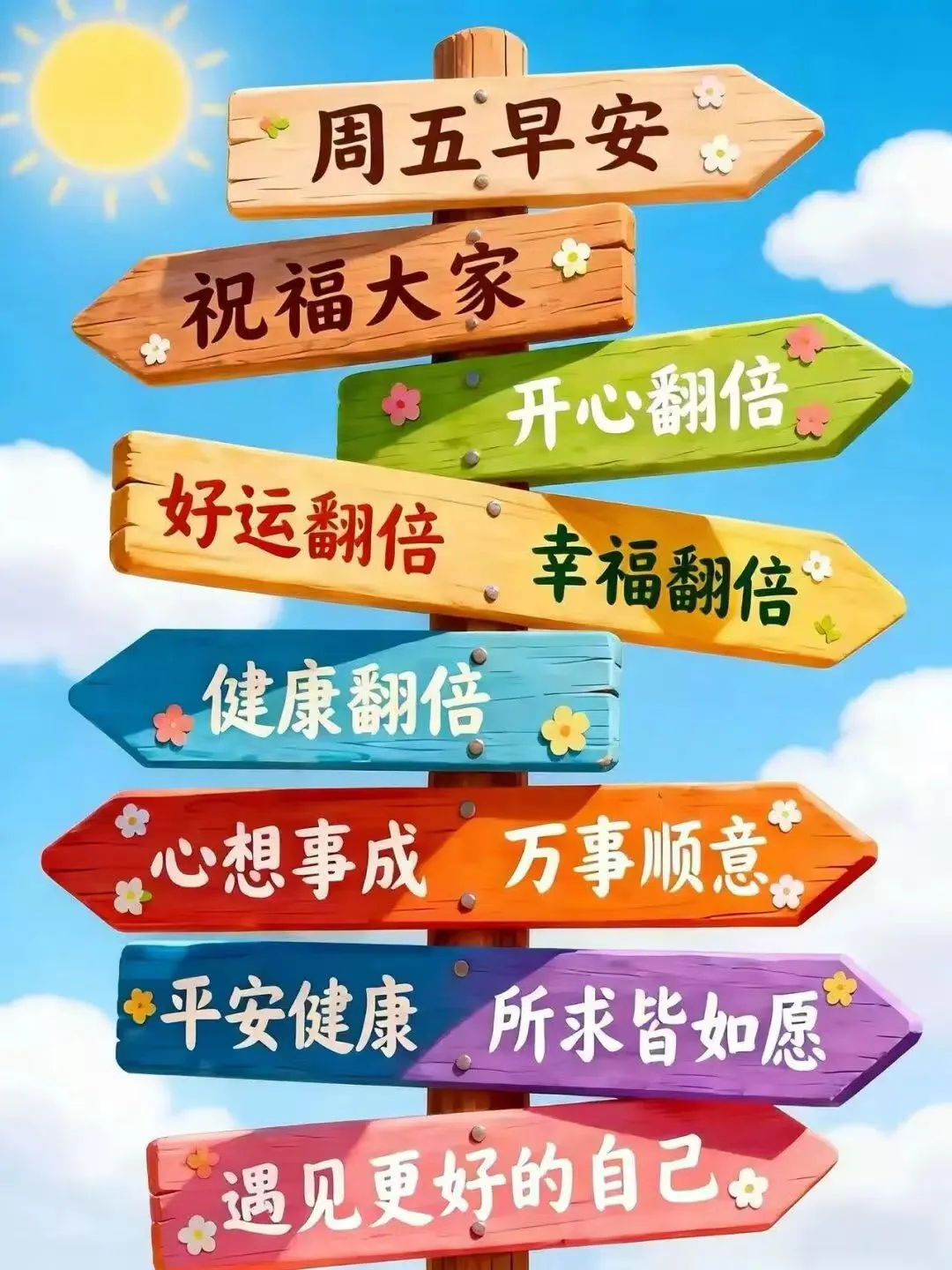 周五愉快!愿健康常伴左右,平安岁岁无忧;愿幸福日日降临,喜乐时时相随。保持一份好心情,心怀温柔与感恩,让生活处处有温暖,人间时时有真情。新的一天,愿我们眼里有光、心中有爱,日子阳光灿烂,永远笑口常开。🎉⭐🌹