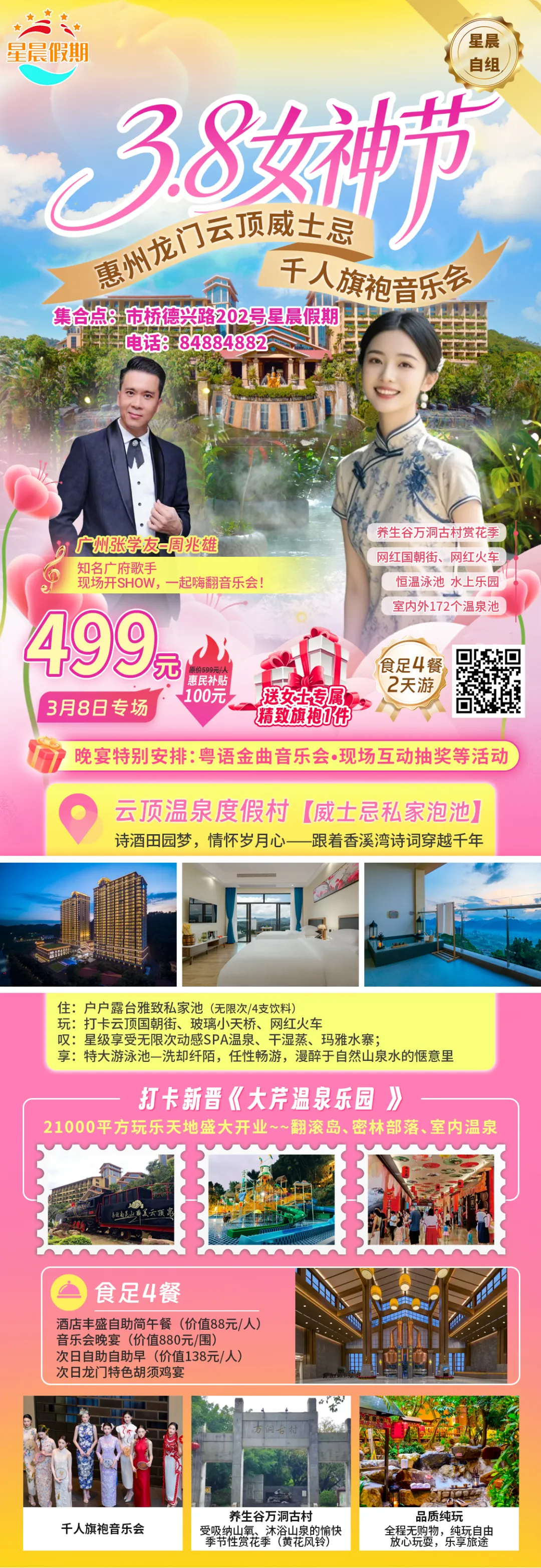 番禺独家!3.8女神节出发!星晨自组惠州龙门云顶温泉纯玩两天!粤语金曲晚会+现场互动抽奖!广州张学友前来开show!千人旗袍音乐会专场