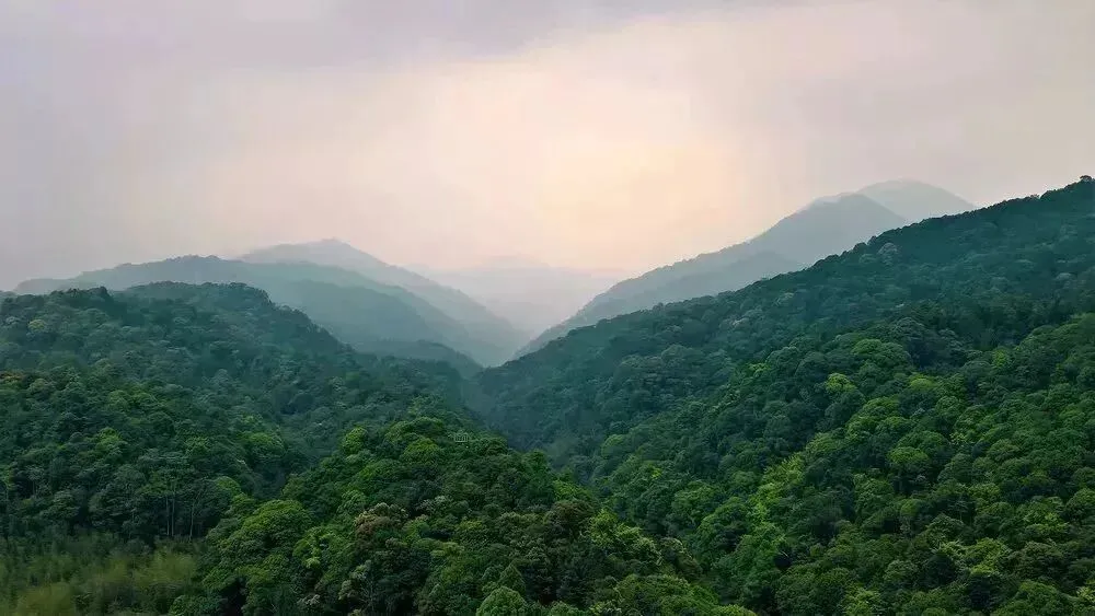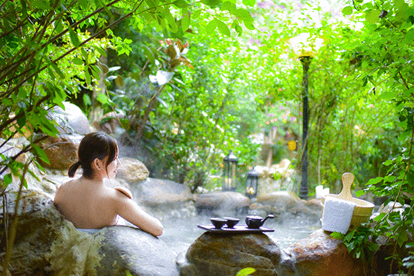 沿山而建的泡池郁郁葱葱,林木遮掩...
