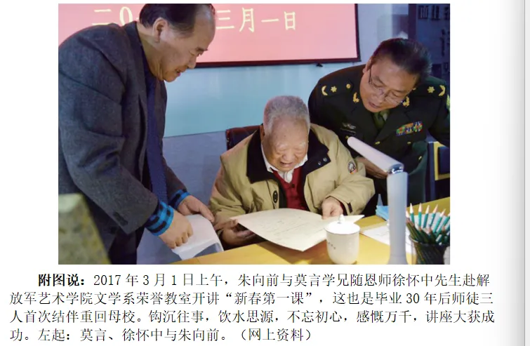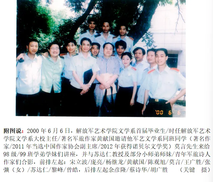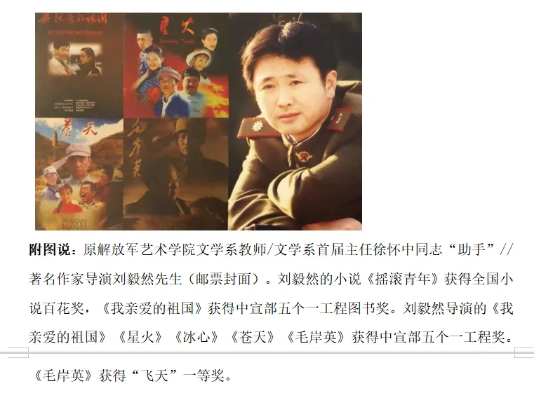 附2原解放军艺术学院文学系教师/著名作家导演刘毅然同志和苏达仁老师鼎力协助首届主任徐怀中同志当好“助手”,在徐主任的引路下文学系首届35个学员中走出了著名作家莫言(管谟业)、朱向前、黄献国、李存葆、李荃、苗长水、宋学武、董保存、钱钢、何继青、王海鸰、王苏红、刘宏伟、刘英学等;
