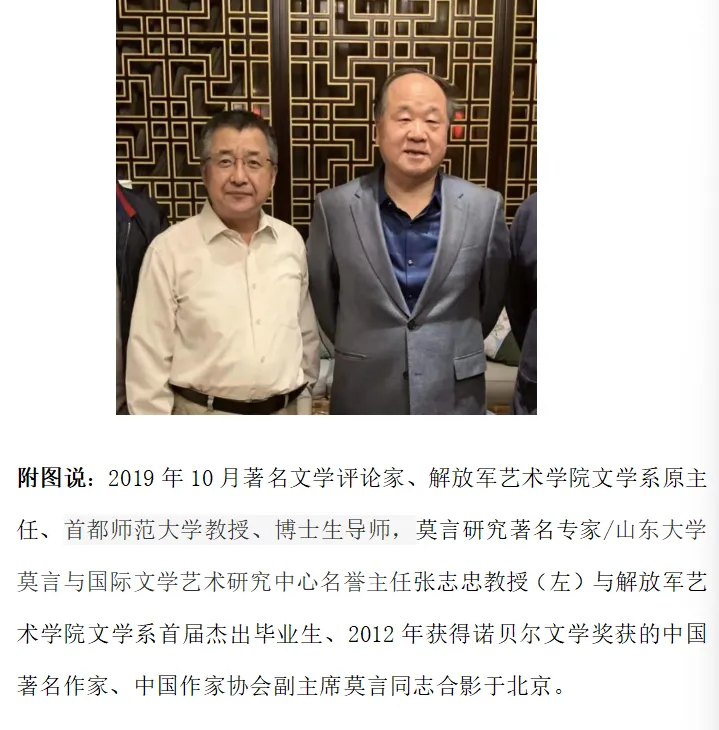 附131998年9月1日至2000年7月,笔者作为解放军艺术学院文学系第7届学员先后历经了两任系主任,著名文学评论家/中国作家协会会员/1990年3月在中国社会科学出版社公开出版《莫言论》专著的张志忠教授, 著名作家编剧/解放军艺术学院文学系首届优秀毕业生/中国作家协会会员黄献国教授。我是在张主任主持工作时被录取上军艺文学系,是在黄主任主持工作时完成毕业的。我以为张黄主任在学院院长申万胜将军作家书法家/学院政委殷宝洪将军作家书法家等领导指导下,在系政委/著名作家书法家/中国作家协会会员谭友鹏及学员队队长赵庆慧/学员队政委尹敬书,以及系教职员工老师刘毅然/苏达仁/吕永泽/宋学武/邢军纪/许福芦/张方/张志强/徐晴/苏达仁/胡正峰/徐萨平/陈曦/谭晓明等支持下都很认真敬业和伟大的人格高尚的品德,我由衷永远感谢和致敬他们……