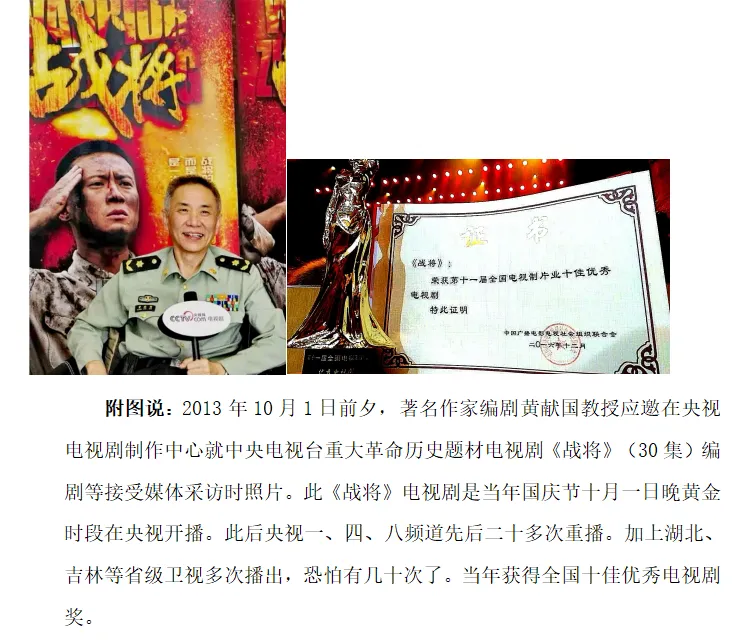 附10《高山下的花环》(李存葆)《战将》黄献国)、《毛岸英》刘毅然)、突出重围》(柳建伟)、《历史的天空》徐贵祥)、《暗算》麦家)、《亮剑》(江奇涛)激情燃烧的岁月》(石钟山)、《和平年代》张波/赵琪)、《父母爱情刘静)、《中华之门》李荃)、《人世间》王海鸰)、《长津湖》王筠)、《冲出亚马逊》王戈洪)、《跨过鸭绿江》余飞)、《火蓝刀锋》冯冀)、《天仙配》曾有情)、《围猎》《清网行动》(丁潍河)等几十部具有全国影响的大型电视连续剧近百部电影的剧本均出自徐怀中老爷子弟子或弟子的弟子军艺文学系教师之手。