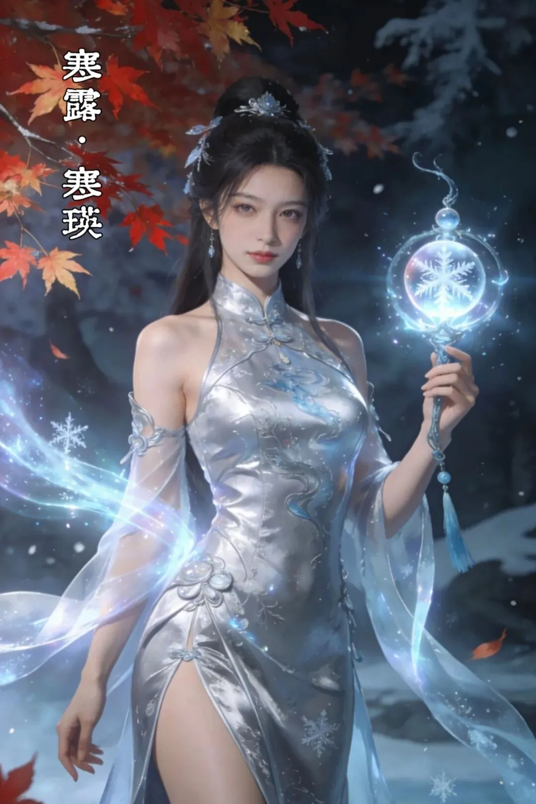 她身着一袭流光银色长裙,如寒夜霜华,似空山冷月,周身萦绕着清冽微凉的寒气,不灼人,却自带疏离秋意。乌黑发髻间斜插一枝艳红枫叶,银红相映,更显绝色。容颜清丽绝尘,眉眼间带着几分不染尘俗的孤傲,眼神沉静如寒潭,藏着一整个深秋的清冷与诗意,望之便让人心静。