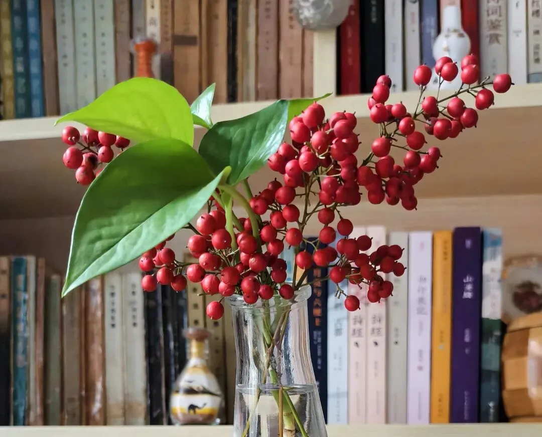 土养的绿萝终究还是败给了冬天。自入冬后叶子日渐稀疏,消瘦得不忍直视。索性连根拔起,洗净根系,插进清水玻璃瓶中,与红艳的南天竹相依相衬。倒也应了那句俗得可爱的话:红配绿,看不足,爱不尽。