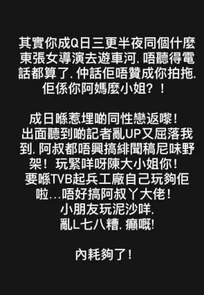 黄润成去年在社交平台大数「旧爱」,指同属TVB的女艺人「喺TVB起兵工厂」,又与《东张西望》导演过从甚密,更爆出食大麻等严重指控,之后又追击「陈大小姐」:「道德?!边界感/同理心-1k嘅人,仲讲乜X嘢道德!读X数、脑装草、垃圾三观、无药可救!」闹出风波。