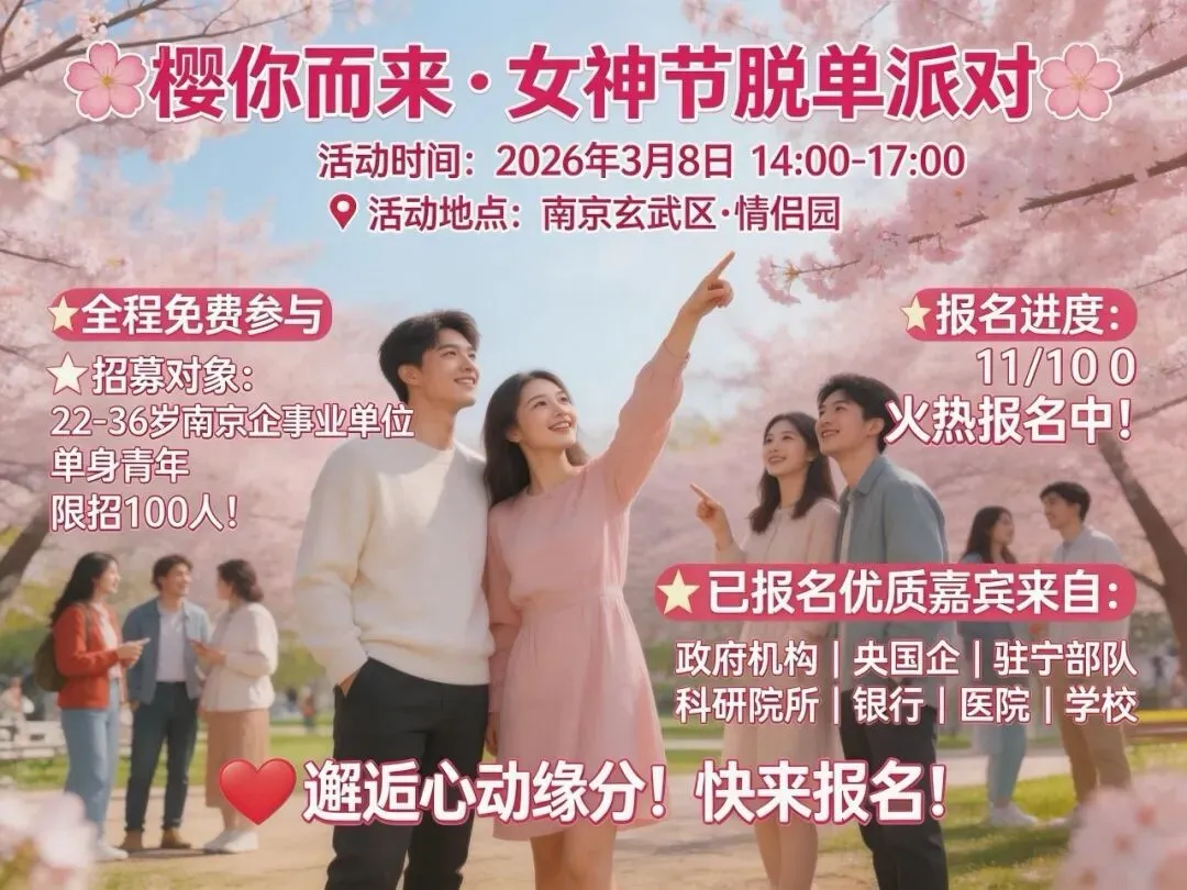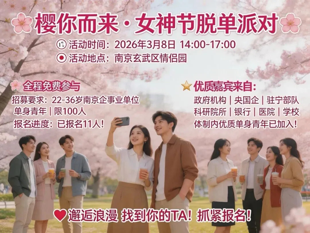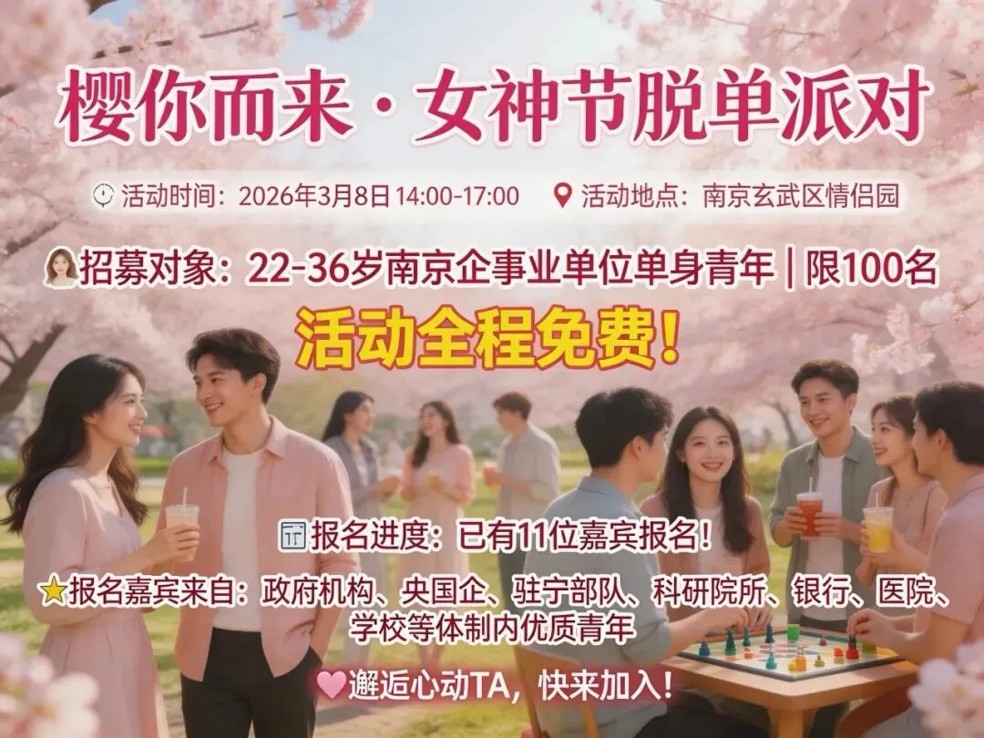 樱你而来·南京3.8女神节免费脱单派对|情侣园樱花下,100位体制内优质单身等你来!