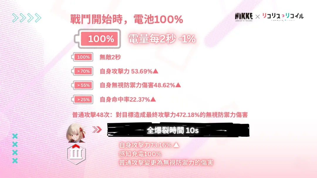 战斗开始与每次进入爆裂时,千束的电量都会直接回满至100%,之后以每2秒1%的速度消耗,因此只要千束是轴内,电量就不会低于70%;在这个区间内,她能同时获得攻击力提升、无视防御伤害加成与命中率强化。另外,她每48次普通攻击就会触发一次472.18%的无视防御伤害,而以每10秒约240发的攻速计算,一次爆裂期间能稳定触发约5次;同时每次电量回满还附带2秒无敌效果,增加队伍容错率。