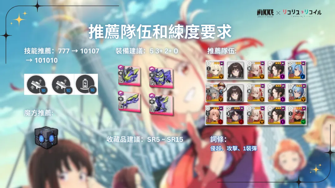 词条选择上,由于千束的伤害集中于普攻和普攻48次附带的技能伤害,在4优4攻的基础上最好要一条装弹,减少换弹时的伤害损失。队伍搭配上,泷奈与她的相性最佳,其次是泛用性极高的艾达王。