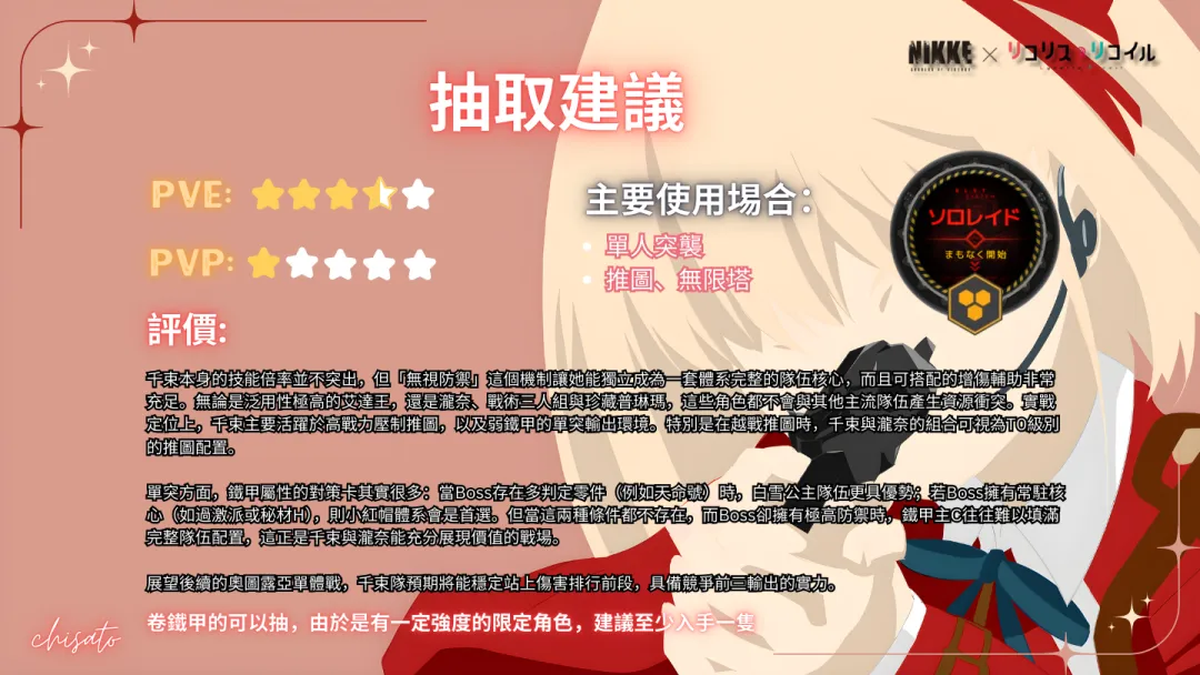 千束主要活跃于高战力压制推图,以及高防御的弱铁甲的单突输出环境