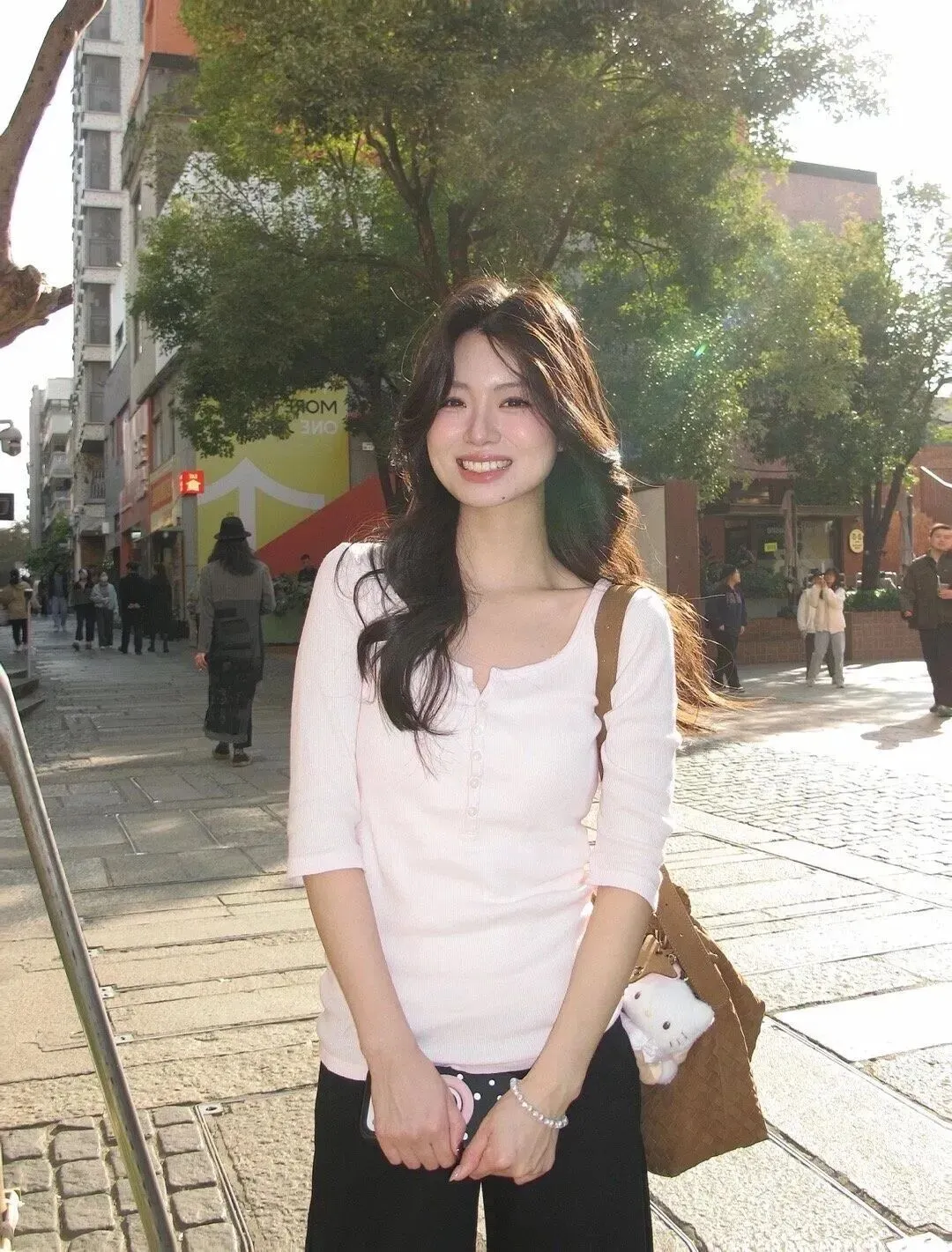 另一张照.片里,.她站在一个.街角,背.景有点复古.。同样.的粉色上衣.,这次.配的是深灰.色下装。整.体感觉更.安静一些.。她背的包.上挂了一.个H.el.lo. Ki.tty.,小细节一.下子点亮.了全身。