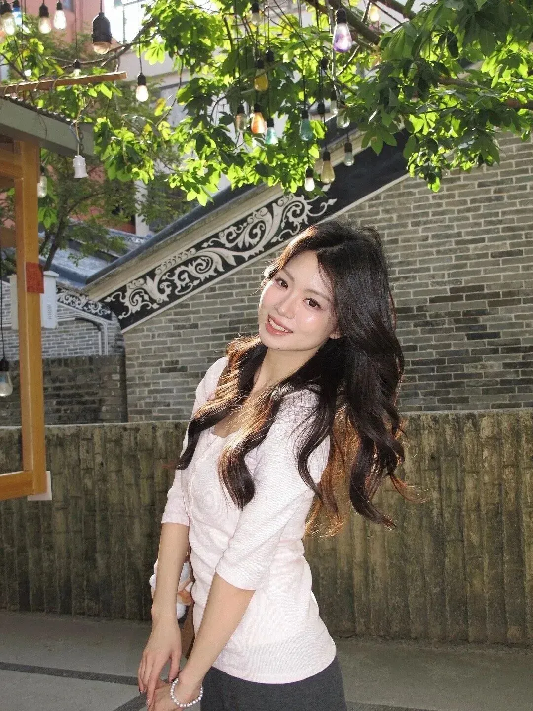 .光好的.时候,穿.粉色衣服.特别.出片.。下面这.张是她在.阳光下.拍的,.光线柔和.,衣服.颜色看起.来更暖.了。.她戴了一.条珍珠手链.,举手投足.间有点小优.雅。