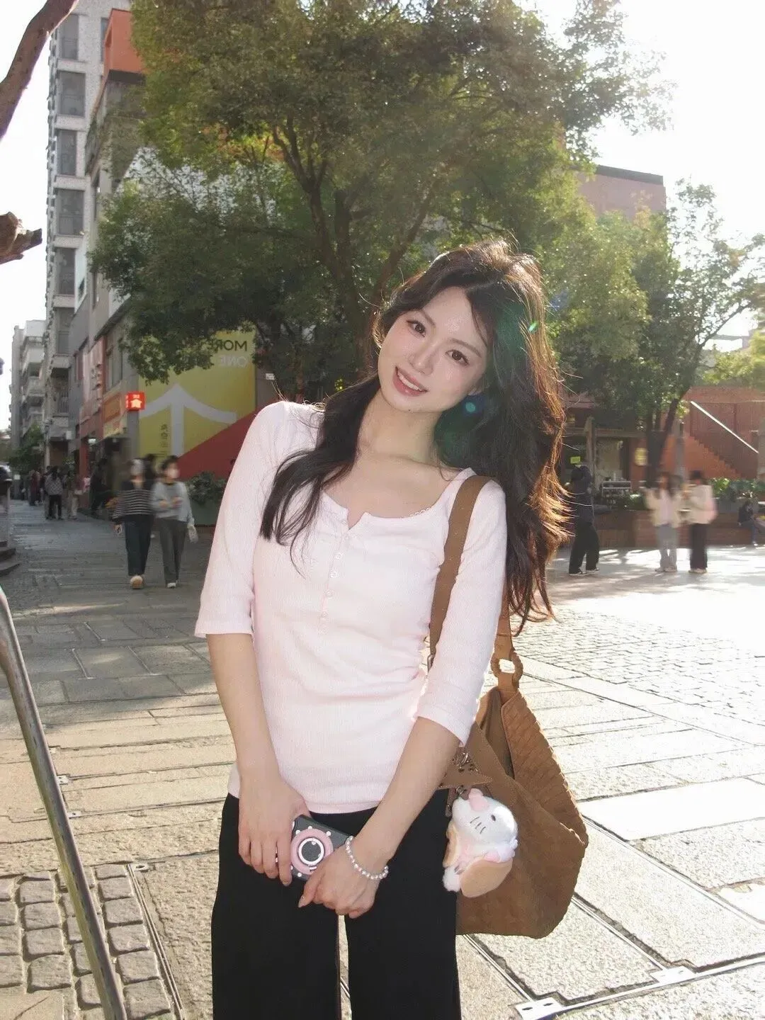 .先来.看看她.穿粉色.针织.上衣的几.张照片。粉.色其实不难.驾驭.,选浅一.点的.颜色就.行。这.件是浅粉色.的,材质是.坑条.针织.,穿.起来不会显.胖。领.口有几颗.白色纽扣.,小小.的设.计让.衣服多了.点俏皮.