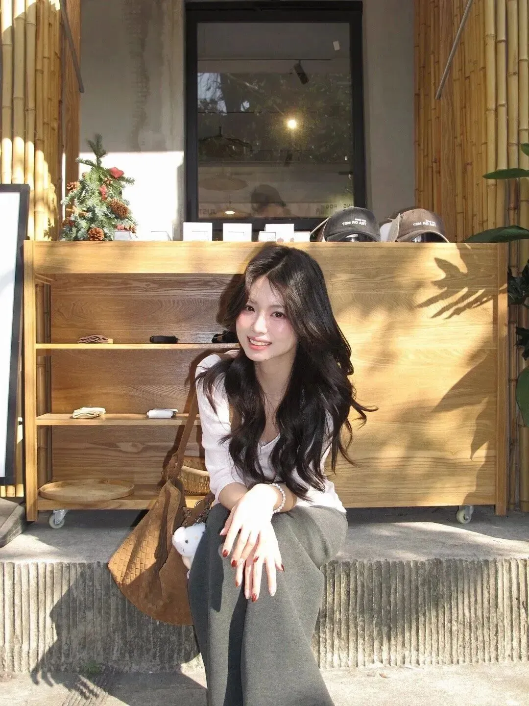 她坐.在一家.店门口.的台阶上.,阳光.晒过来,整.个人.看起来很.放松。包包.上挂了一只.小熊.,多.了点童趣.