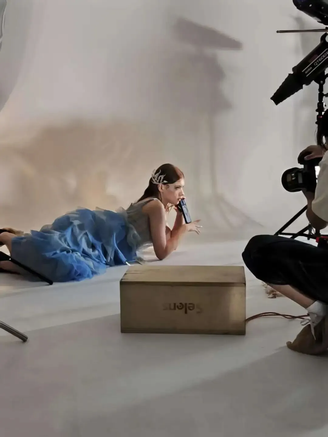 我们把数码产品,拍出了「赛博人鱼」的高级感。客户选择了自带清冷混血感的外籍模特 Valeria,她的骨相和眼神能 hold 住「人鱼与科技」的反差。摄制团队用反光锡纸模拟水面,在纯白影棚里构建出一个超现实的水下世界。