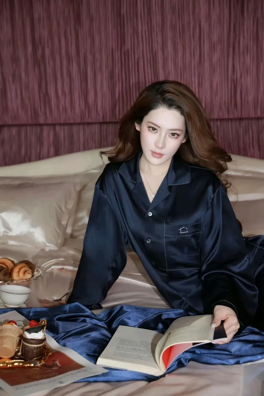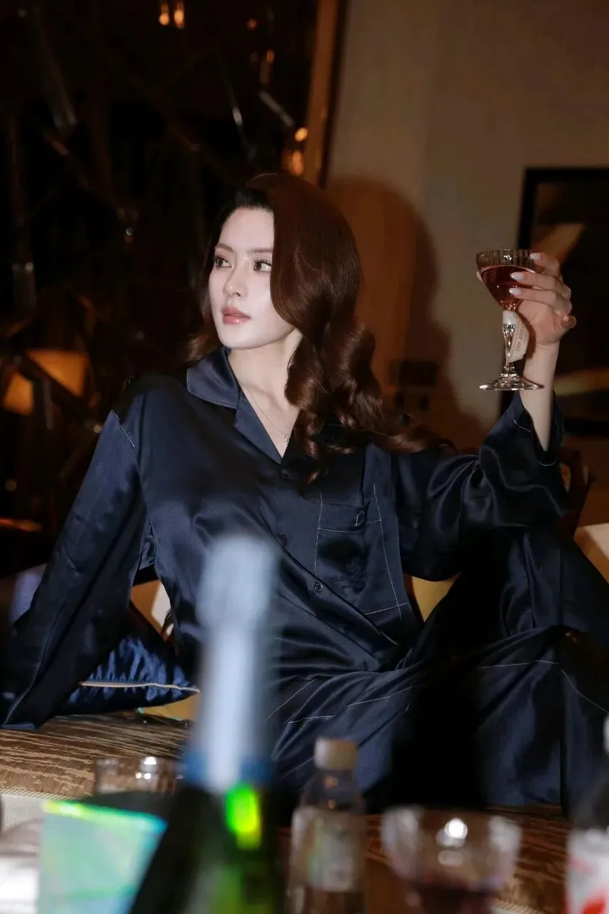 这套睡衣的选择堪称点睛之笔。深蓝色的丝绒材质,在不同光线下呈现出细腻的光泽变化,像深海的绸缎,既低调又奢华。宽松的版型设计,没有刻意勾勒身材曲线,反而让整个人显得更加随性自在。翻领和明线装饰的细节,又增添了一丝精致感,让这套睡衣脱离了“居家服”的范畴,更像是一件可以直接穿出门的时尚单品。