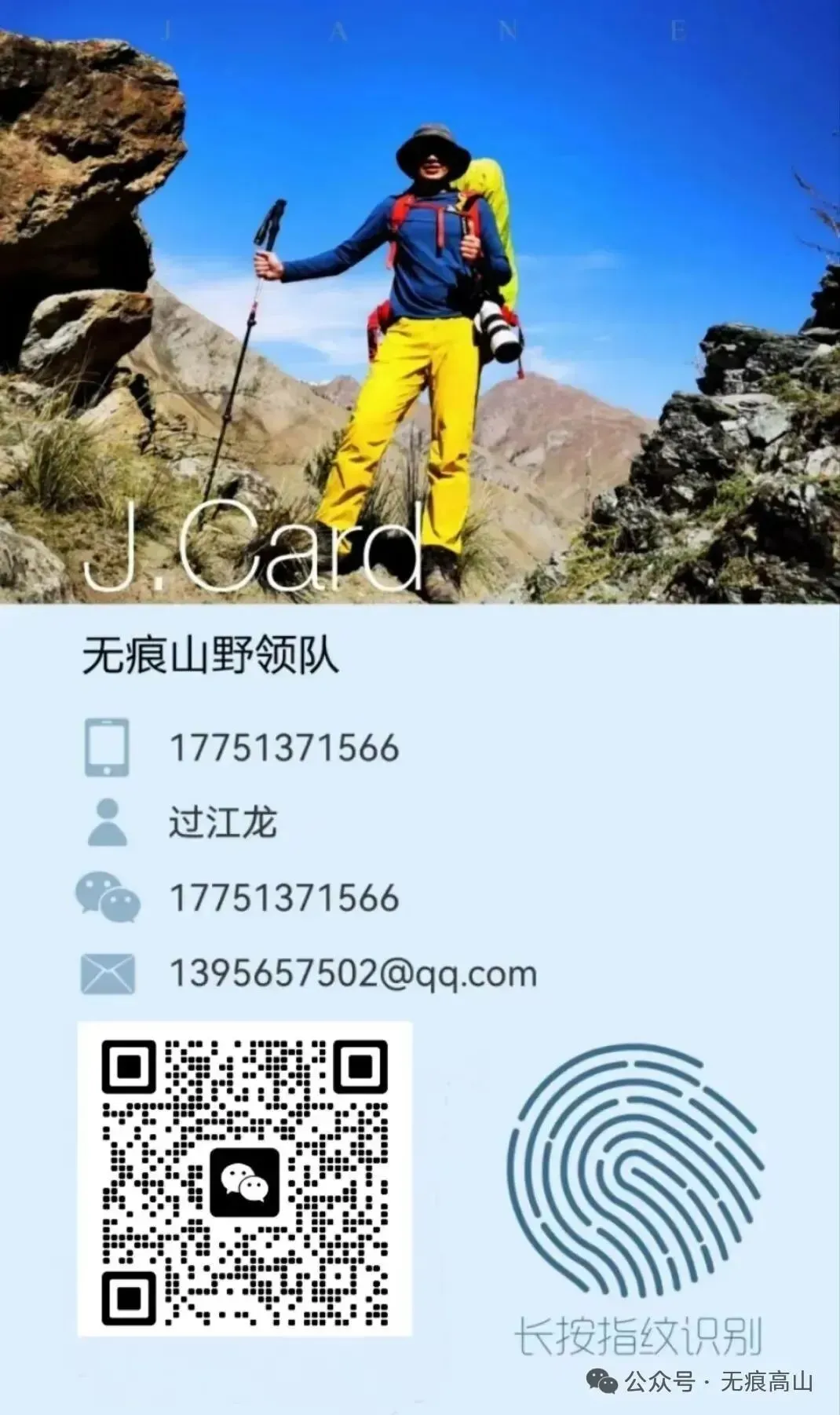 无痕高山户外探险品牌创始人,5000米-8000米雪山攀登,无人区穿越资深领队。青少年营地总监,持证户外指导员,持证营地指导员,持证高山向导,社会体育指导员,持证攀树教练,红十字会急救员,二十四年以上外安全带队经验。
