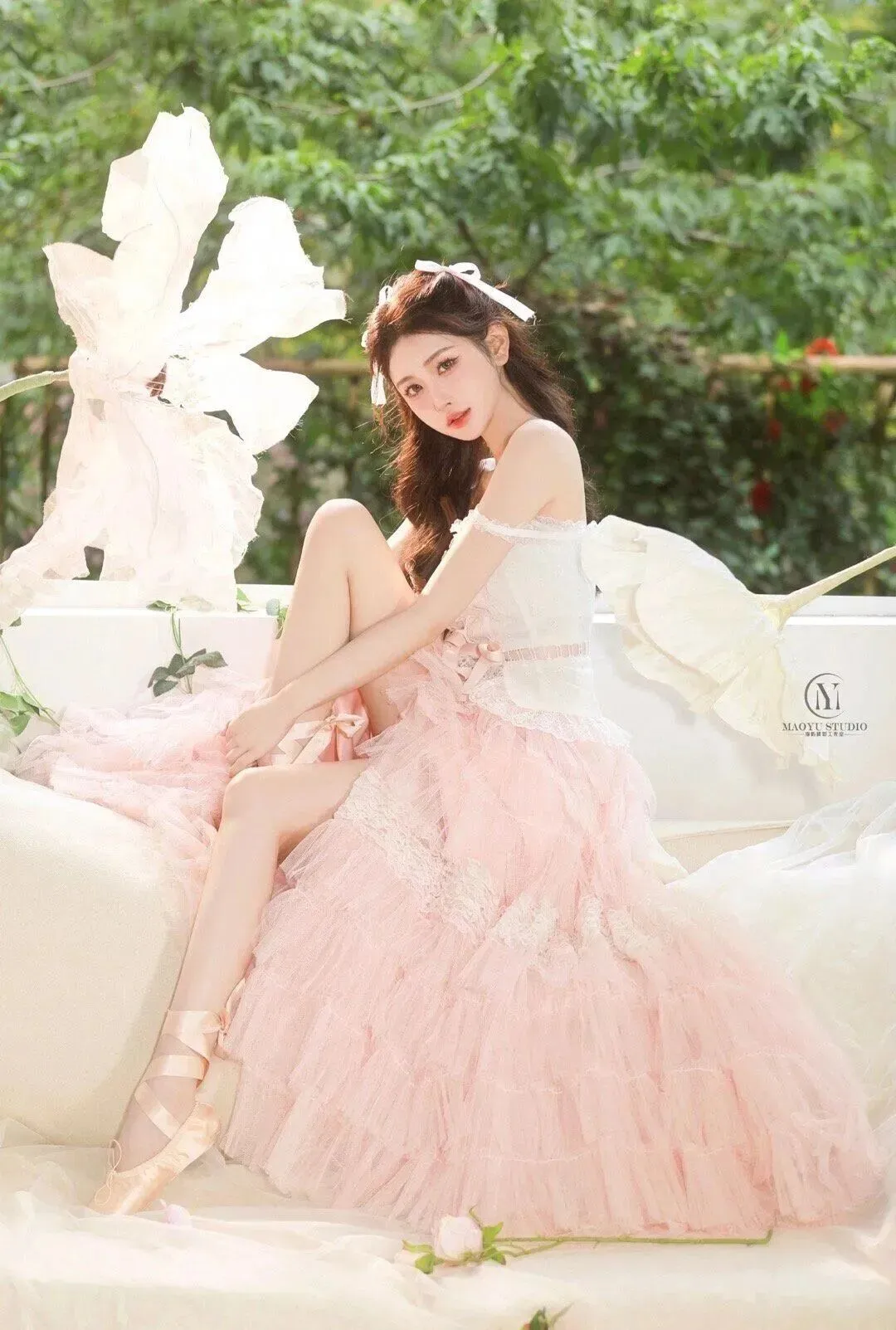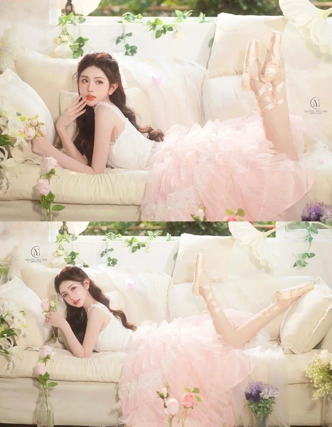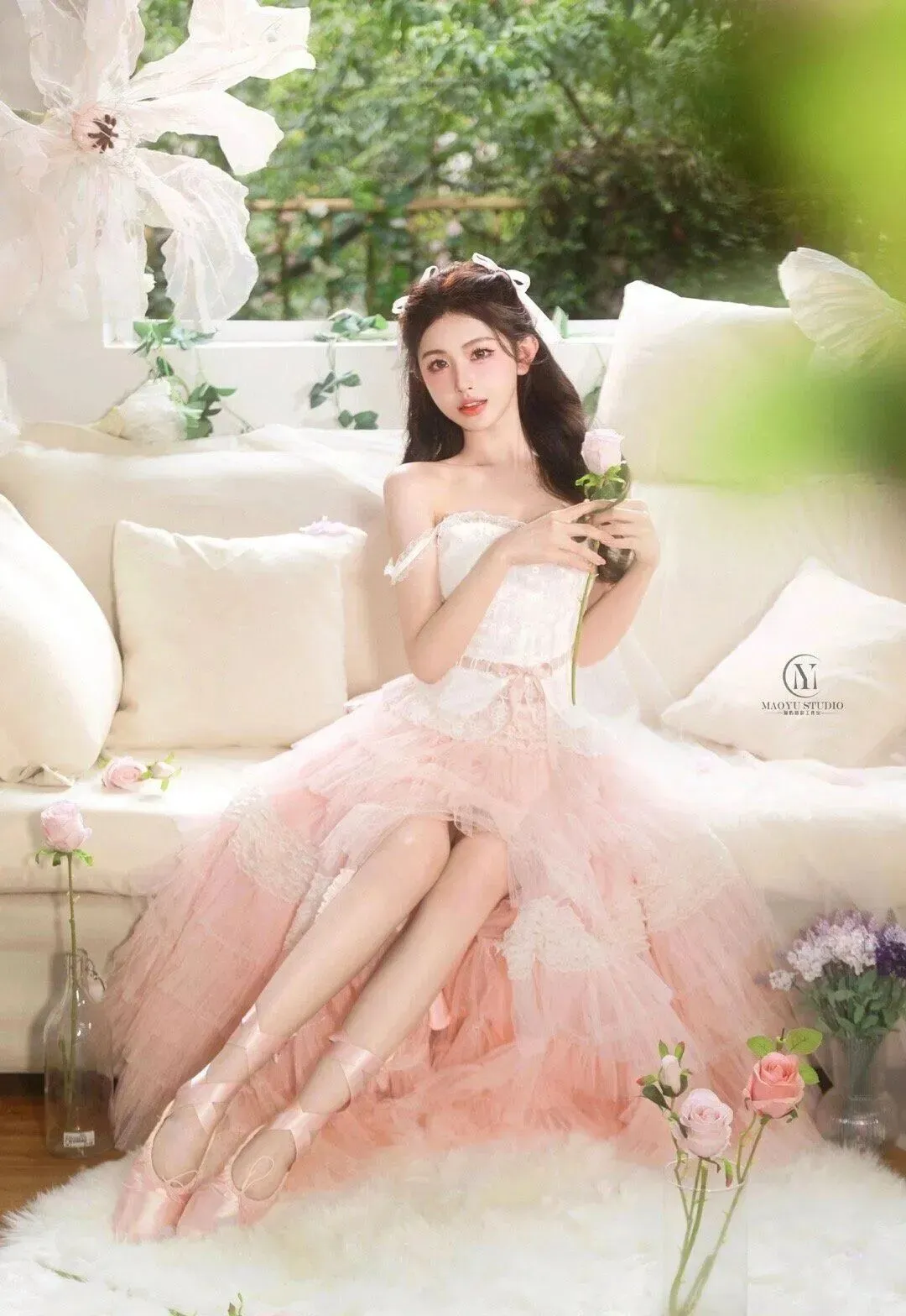 利用现场的浅粉玫瑰、白色抱枕、大纸花和足尖鞋,让模特和道具产生真实互动,比如握花、整理缎带,而不是生硬地拿着;可以在地上散落几朵花,让画面更有生活感。