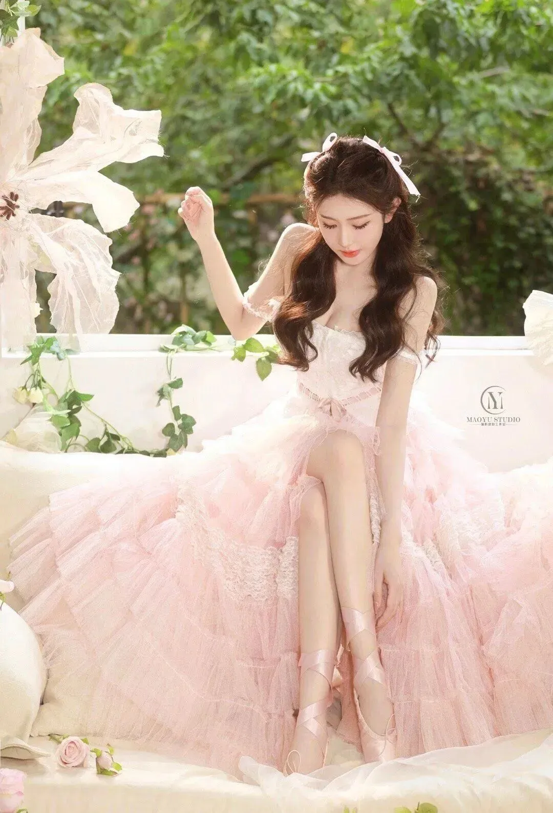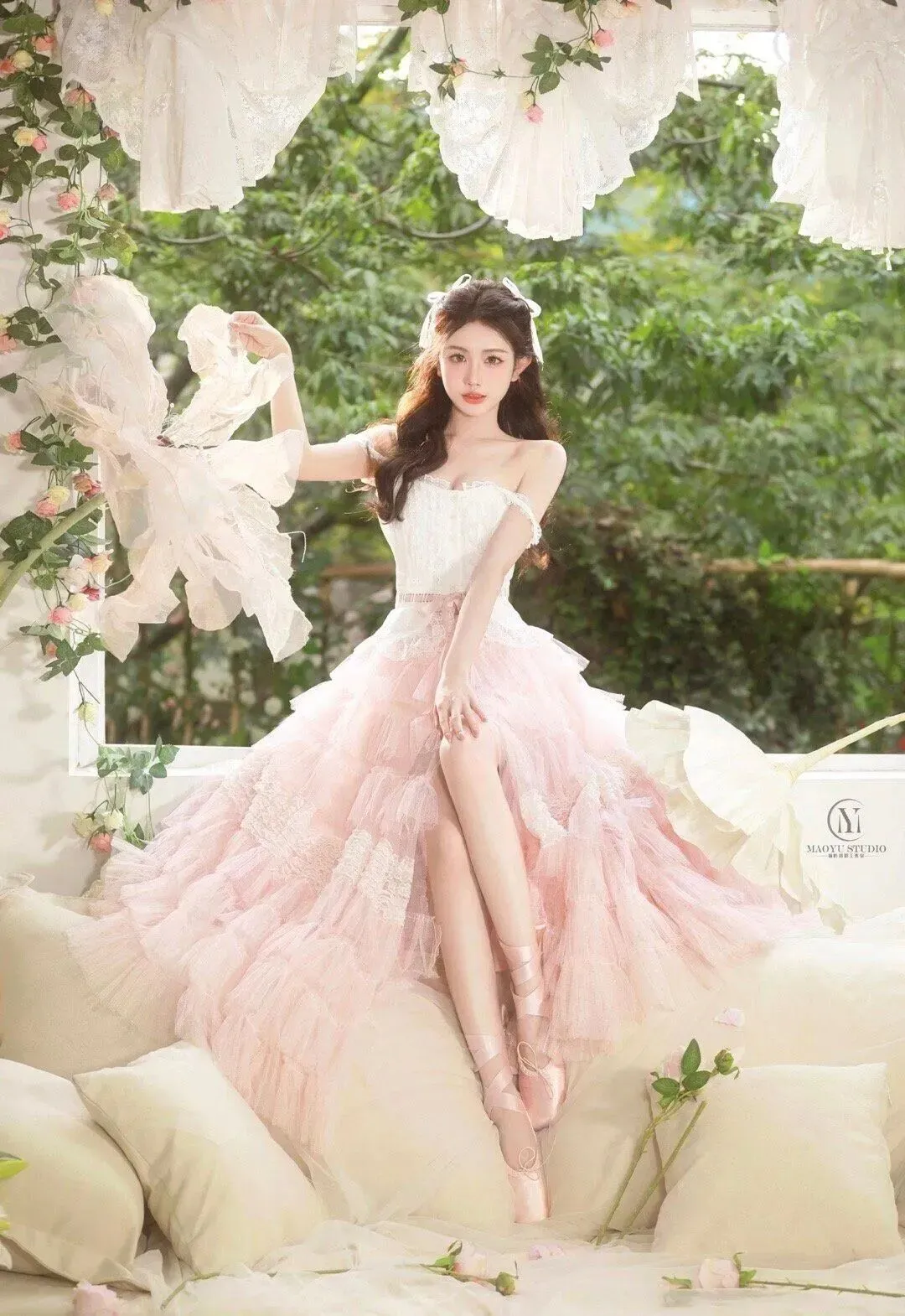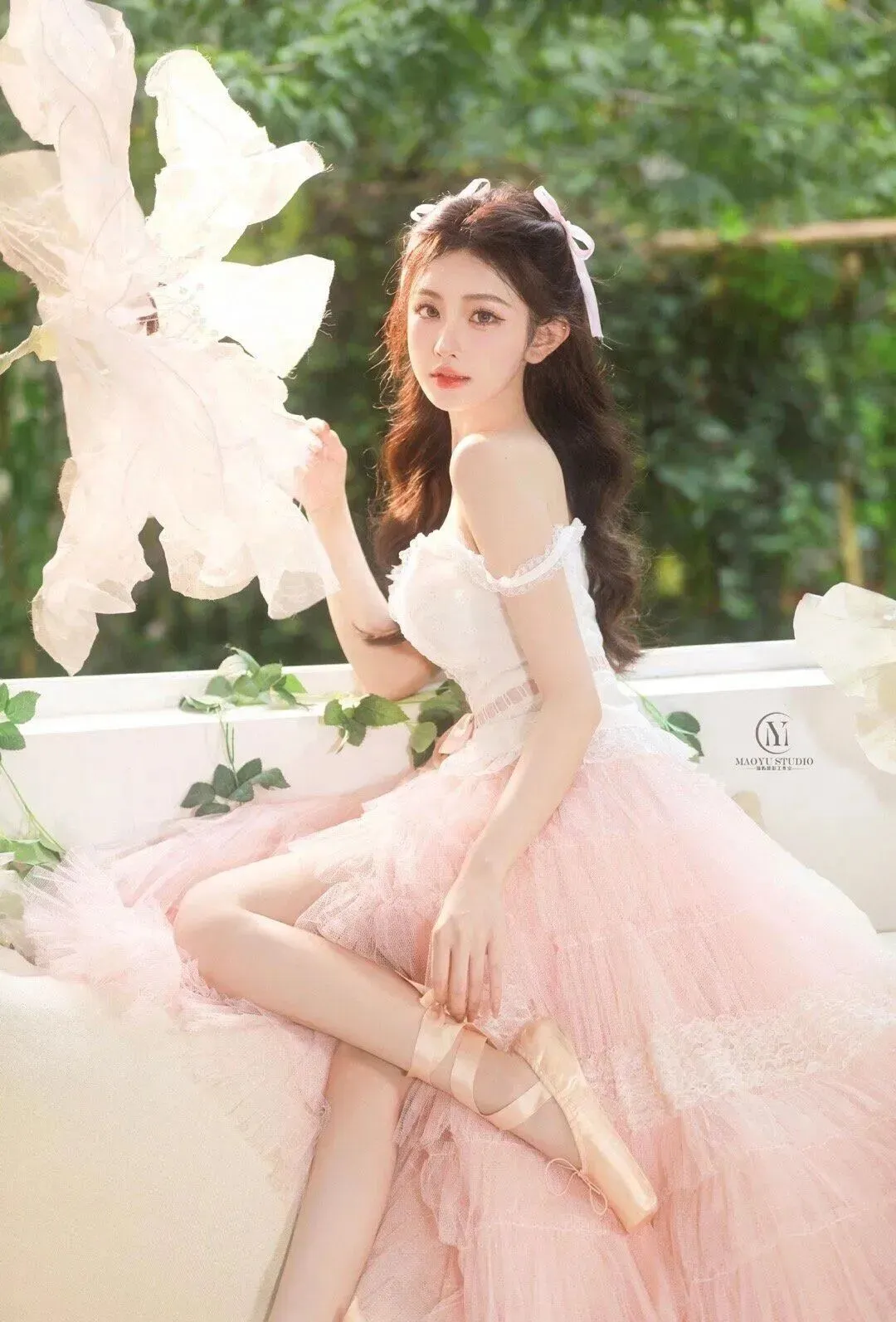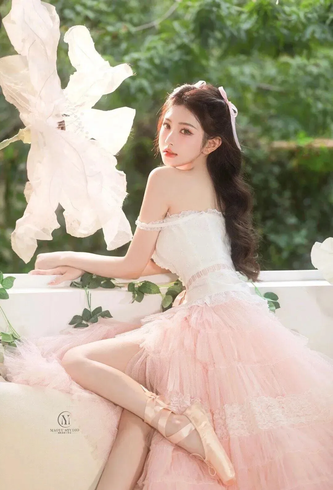 利用现场的浅粉玫瑰、白色抱枕、大纸花和足尖鞋,让模特和道具产生真实互动,比如握花、整理缎带,而不是生硬地拿着;可以在地上散落几朵花,让画面更有生活感。