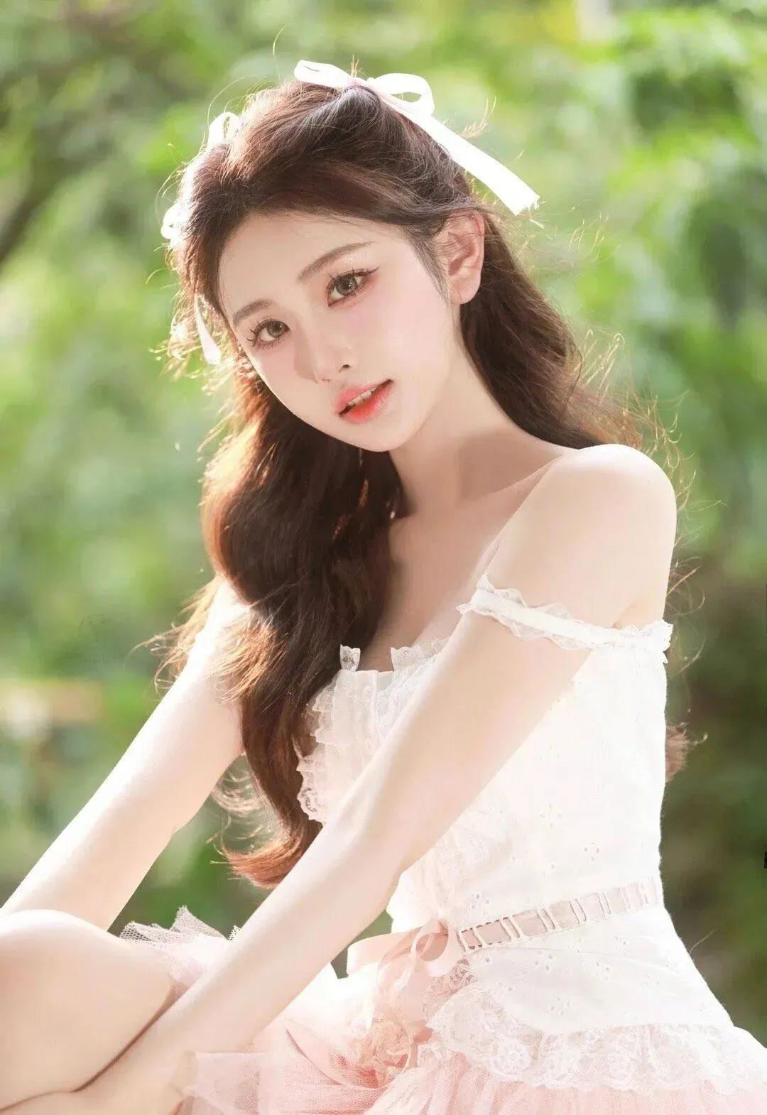 让她侧身坐在窗台边,手肘轻轻搭在窗沿,手掌托住脸颊,视线看向镜头外的绿植。下午四点的侧光刚好打在侧脸,睫毛在眼下投出小阴影,粉色缎带在发间若隐若现,像在等朋友来喝下午茶。