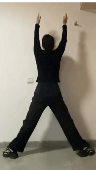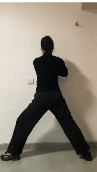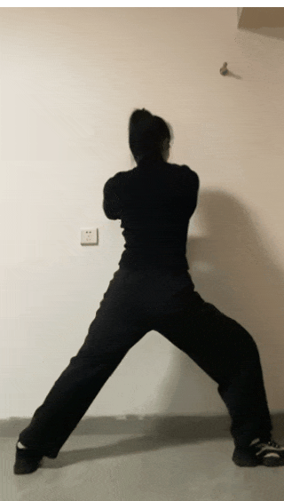 ·  双脚打开一条腿的距离,脚尖、膝盖都保持朝外,收紧腹部,不要塌腰,吸气准备,呼气屈膝下蹲