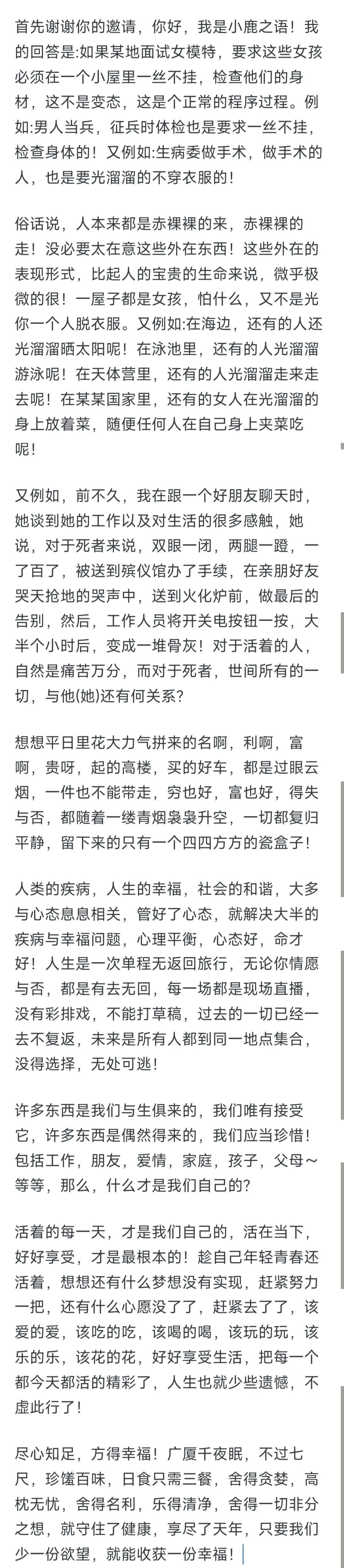 当前位置:首页>美女资讯>情感话题:如果某地面试是女模特,要求这些女孩必须在一个小屋里一丝不挂,检查她们的身体,这是不是很变态?
