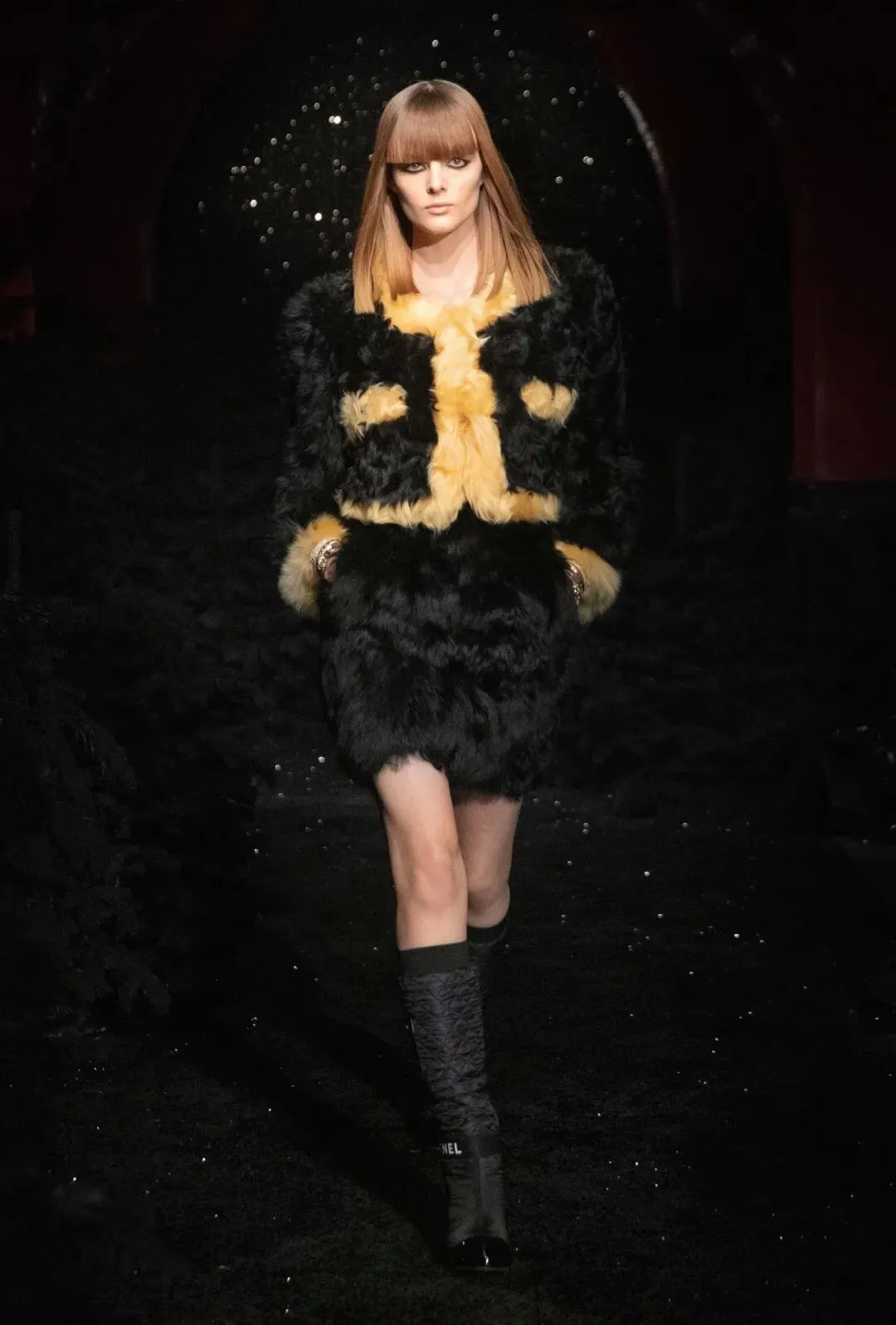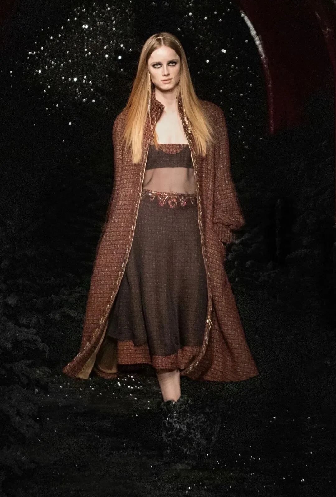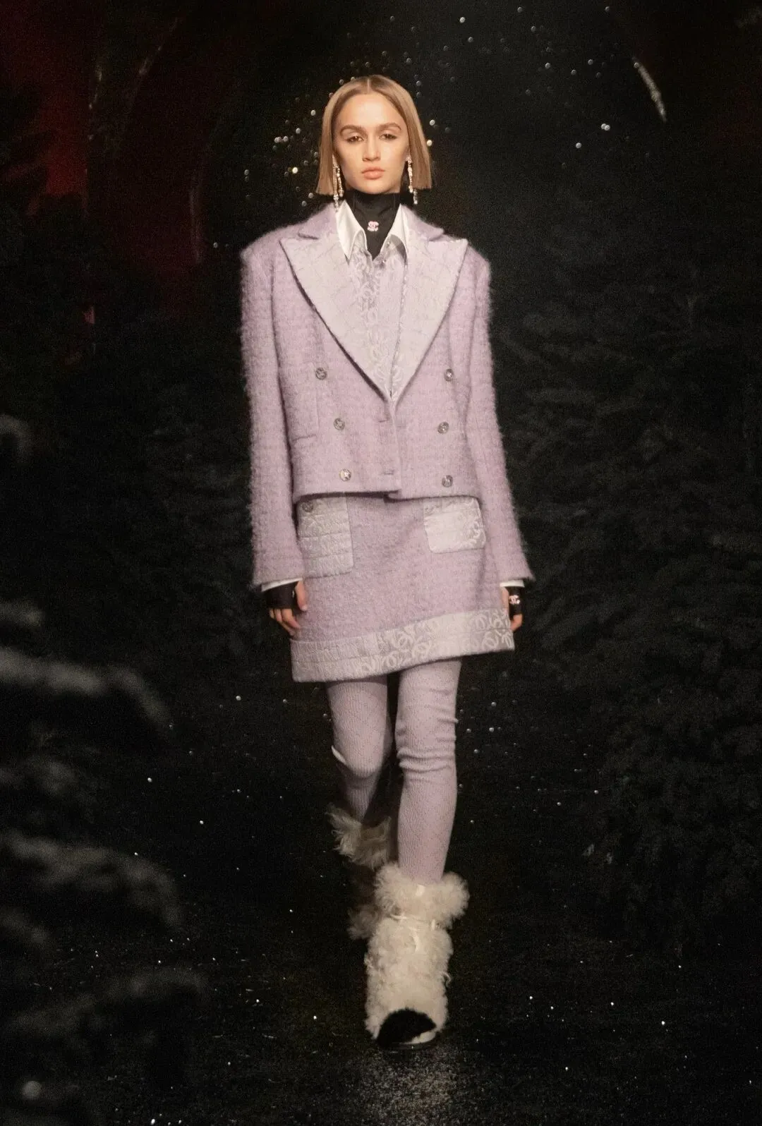 一双双由幻想皮草制作的毛毛靴,套在模特纤细的腿上。与之搭配的是经典的斜纹软呢外套,内搭也处处有半透明的薄纱质感。
