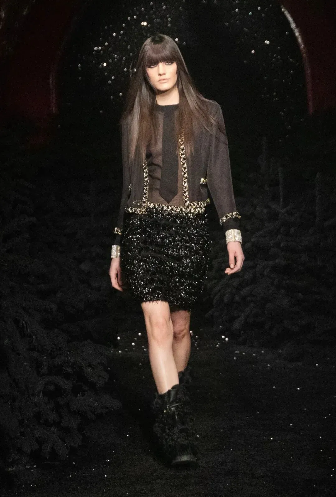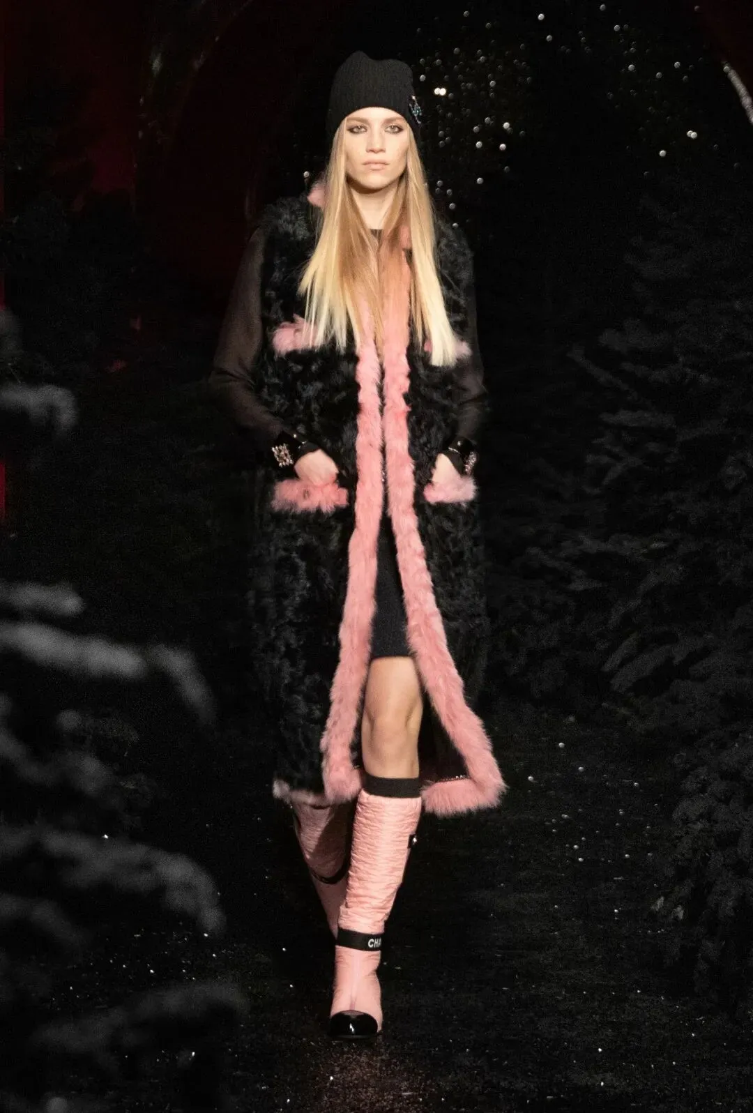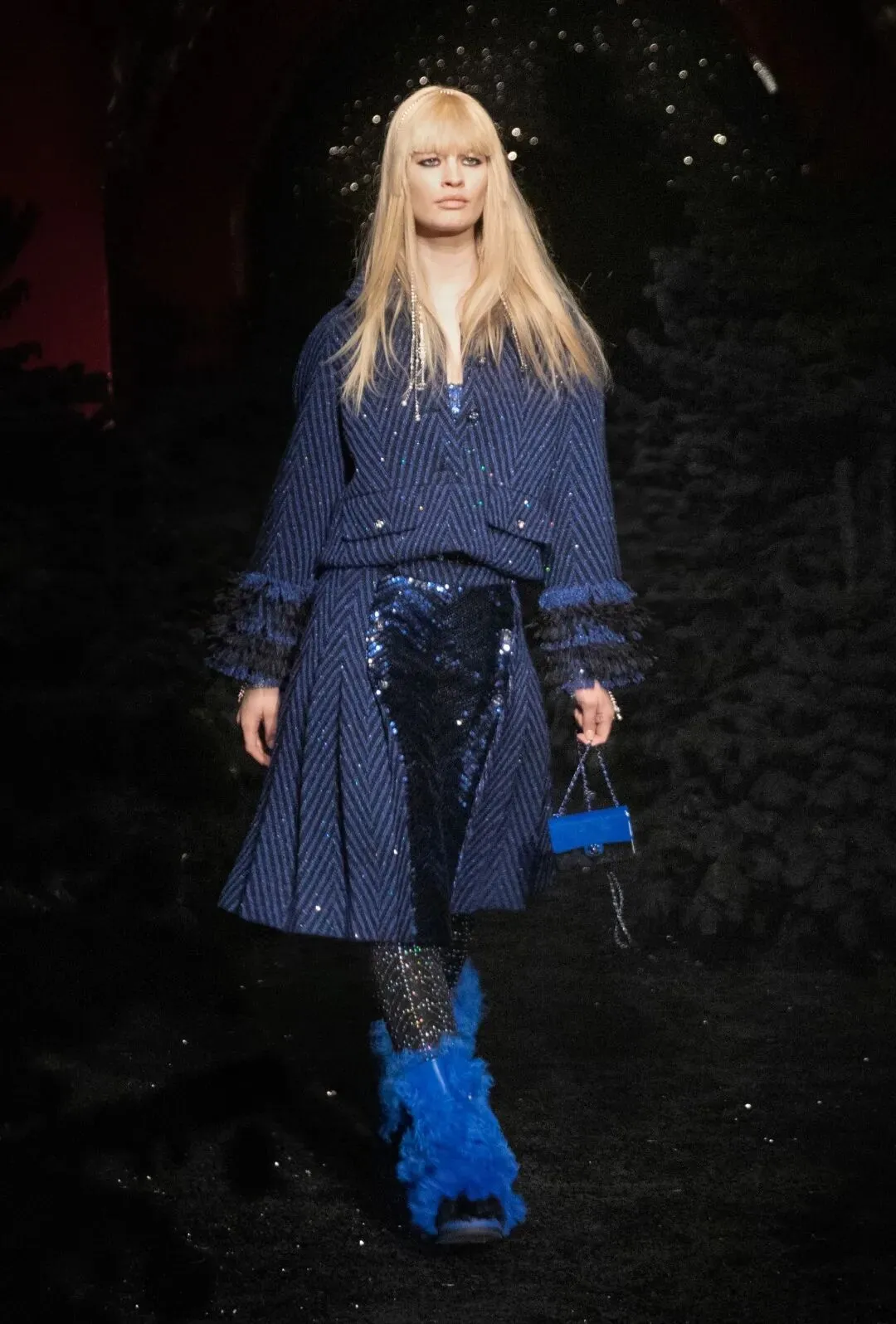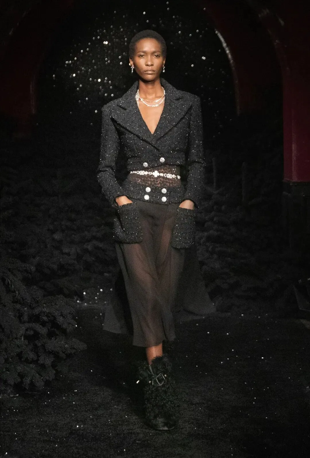 一双双由幻想皮草制作的毛毛靴,套在模特纤细的腿上。与之搭配的是经典的斜纹软呢外套,内搭也处处有半透明的薄纱质感。