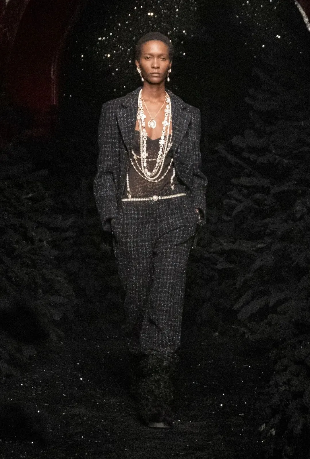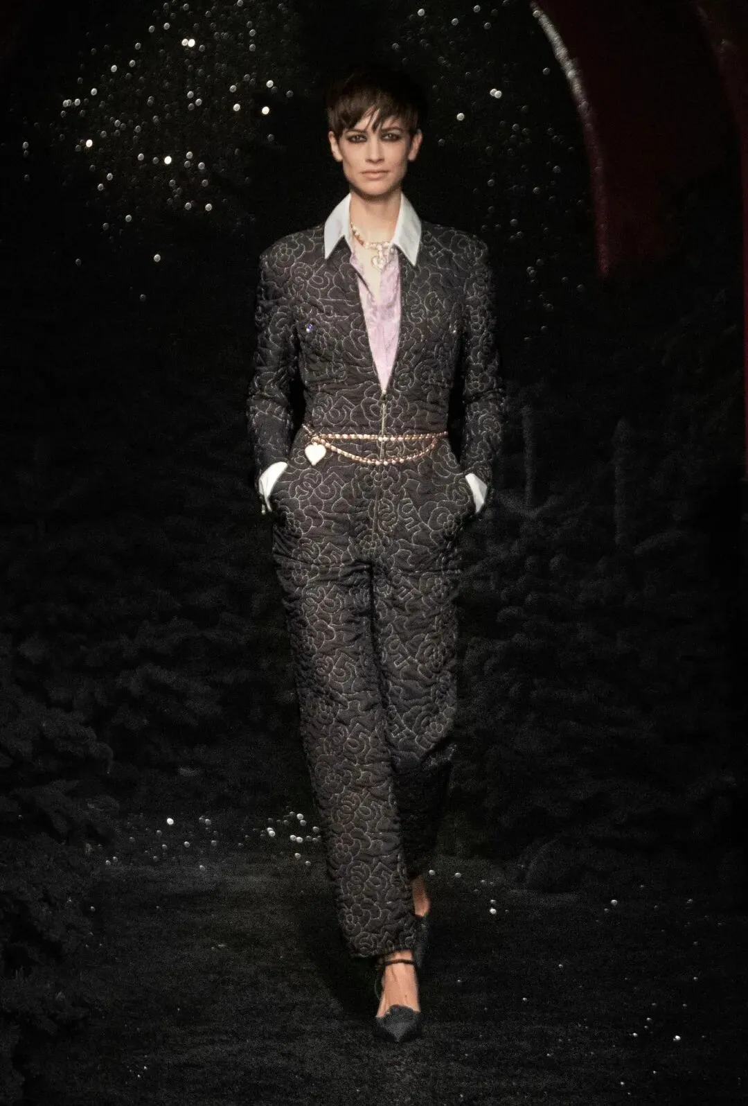 帅气的长裤套装上点缀满精致的刺绣,看似简约的款式上搭配层层叠叠的长项链和珍珠配饰。