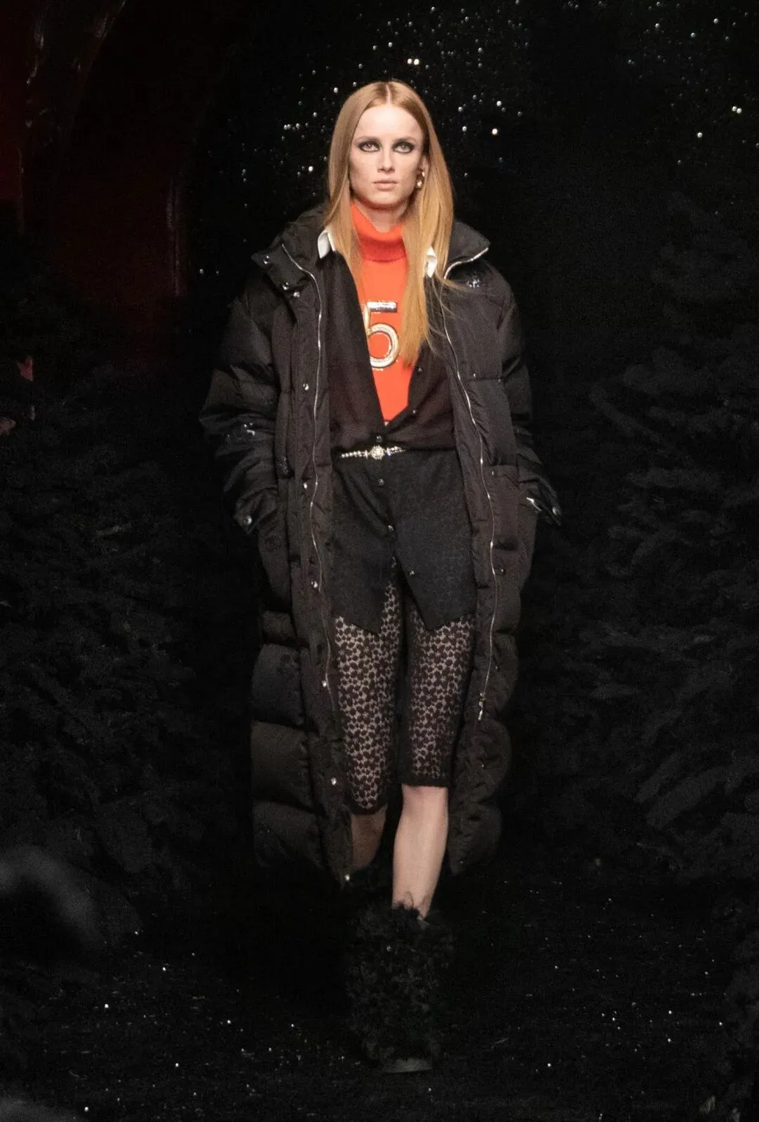 配饰上,有许多值得细看的亮点。比如双色调羽绒靴的靴筒可通过拉链拆卸,变成可以直接穿着去跳舞的银色高跟短靴。