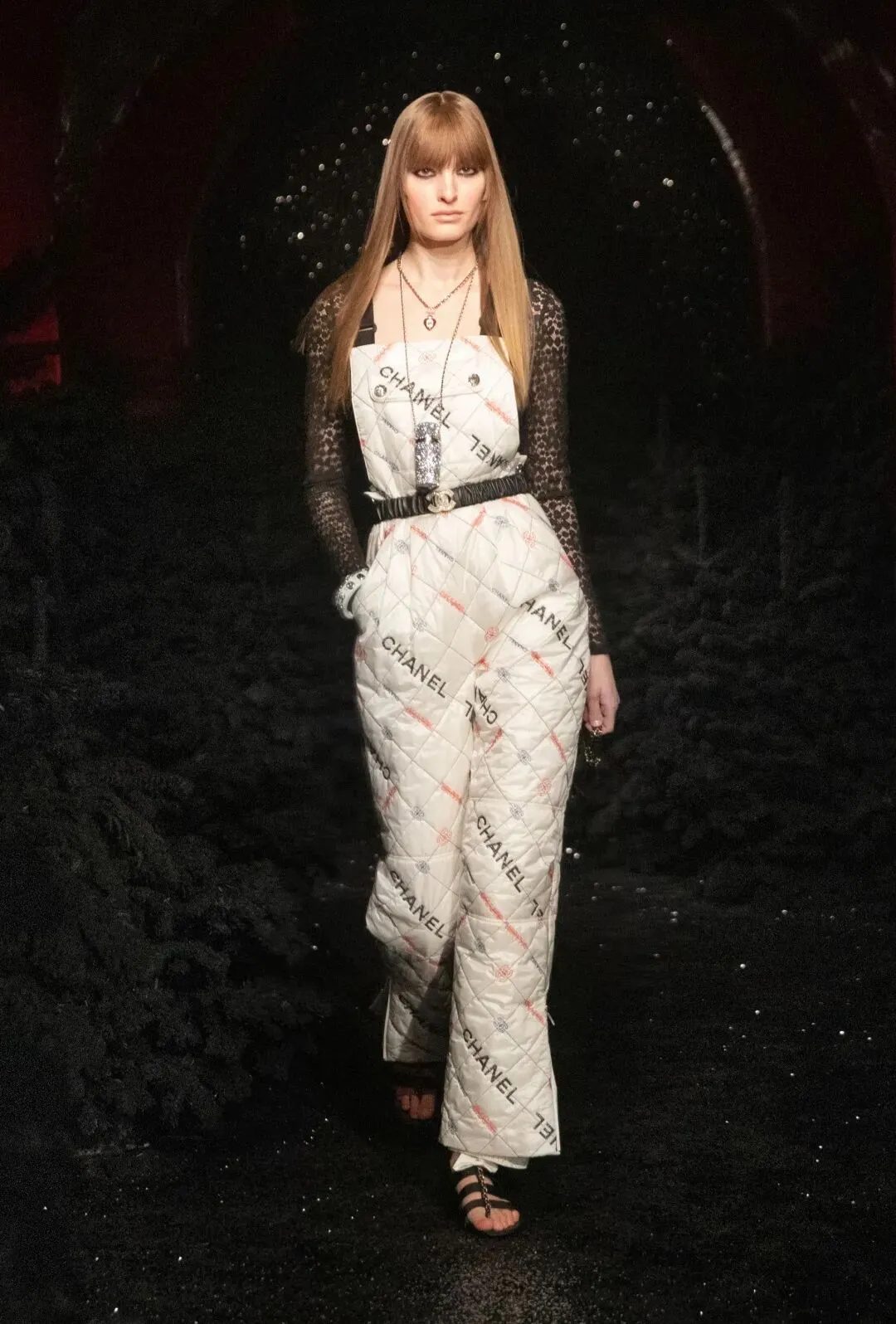 但是滑雪服就一定要配暖和的靴子吗?不一定。模特穿上了饰以链条与黑色小蝴蝶结的绑带凉鞋,或以山茶花装饰的浅口高跟鞋,各种对比又呈现出来了。