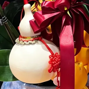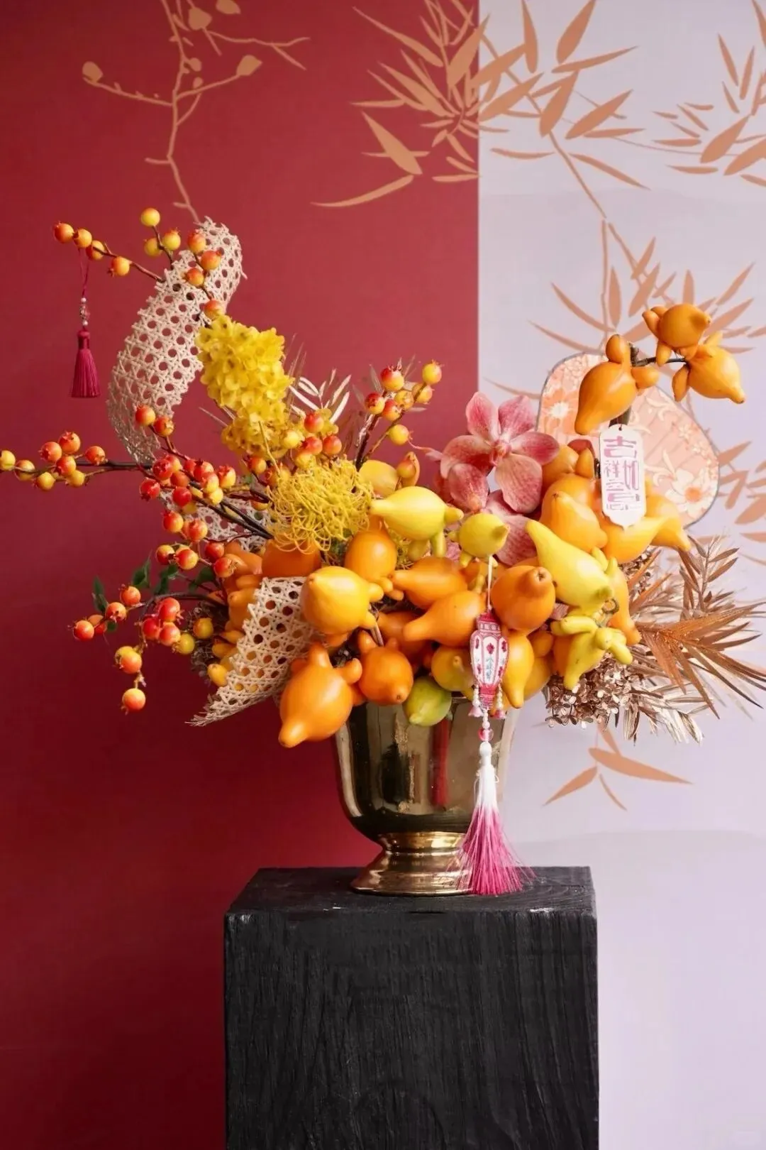 搭配冬青的红果热烈、金瓜的圆满丰盈、葫芦的福禄绵长、蝴蝶兰的优雅翩跹、百合竹的清韵安然……每一枝、每一叶,都是献给女性的温柔寄语: