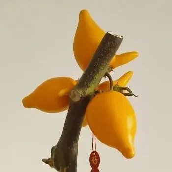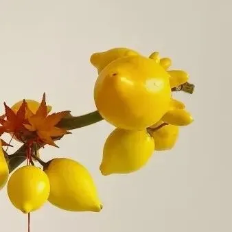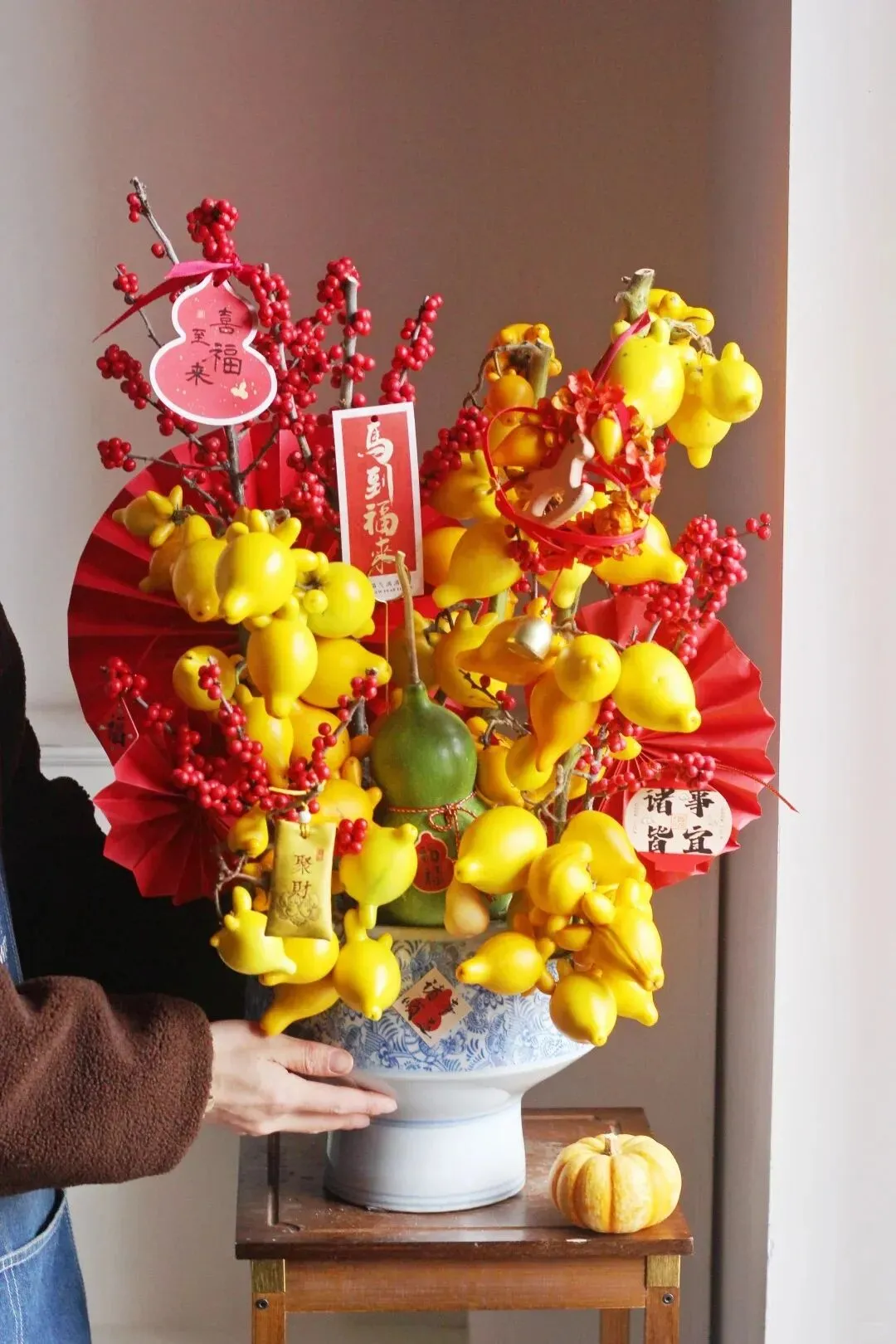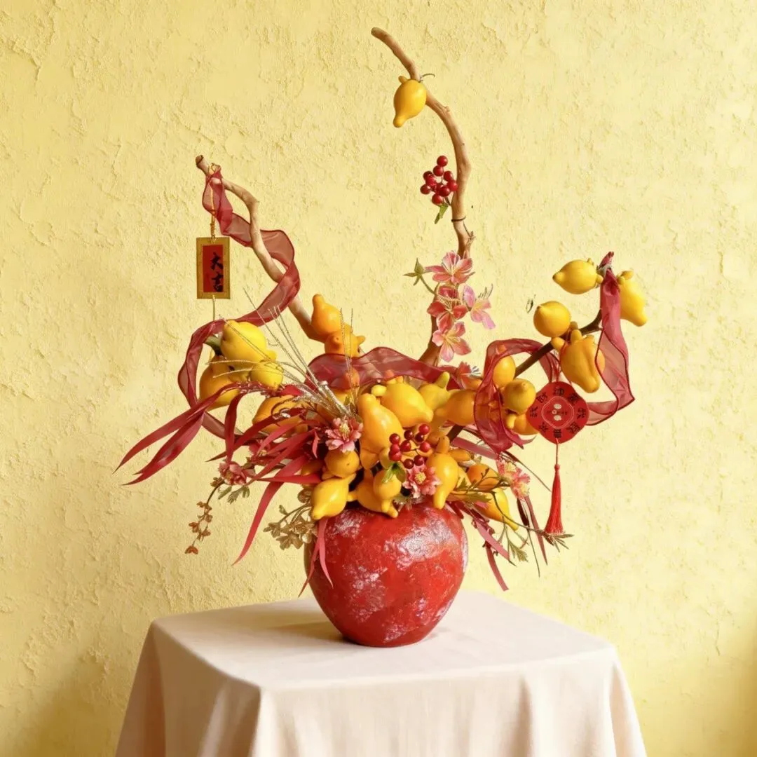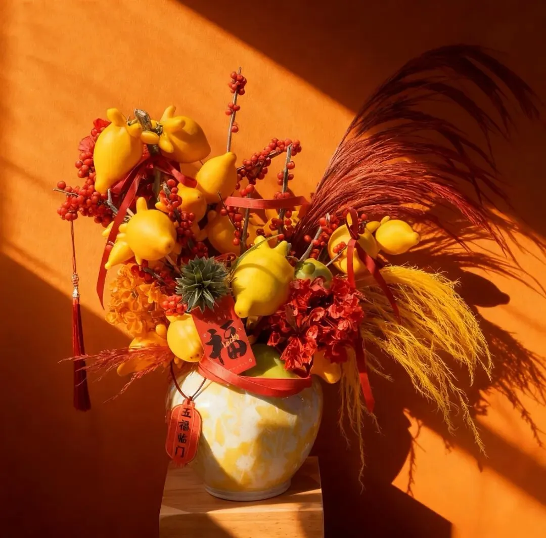 我们以五代果为创作核心,金黄圆润的果实如鎏金缀枝,寓意“金玉满堂,硕果累累”。