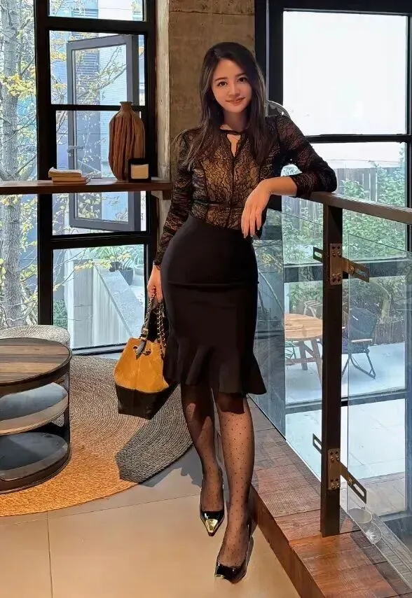配饰部.分才是.亮点。.她穿了黑色.波点丝袜.,搭配.尖头高跟.鞋。.波点设.计带点.复古调.调,让普.通的黑.丝不.再单.调。高跟.鞋是尖头的.,脚背.露得刚.好,.显得腿又.长又细。.手里拎一个.黄黑.配色的手.提包,黄色.部分给整体.添了.一抹.亮色,不.会太沉闷.。包包上还.有金色.链条,.光线下会闪.,精.致感一下.子就上.来了.