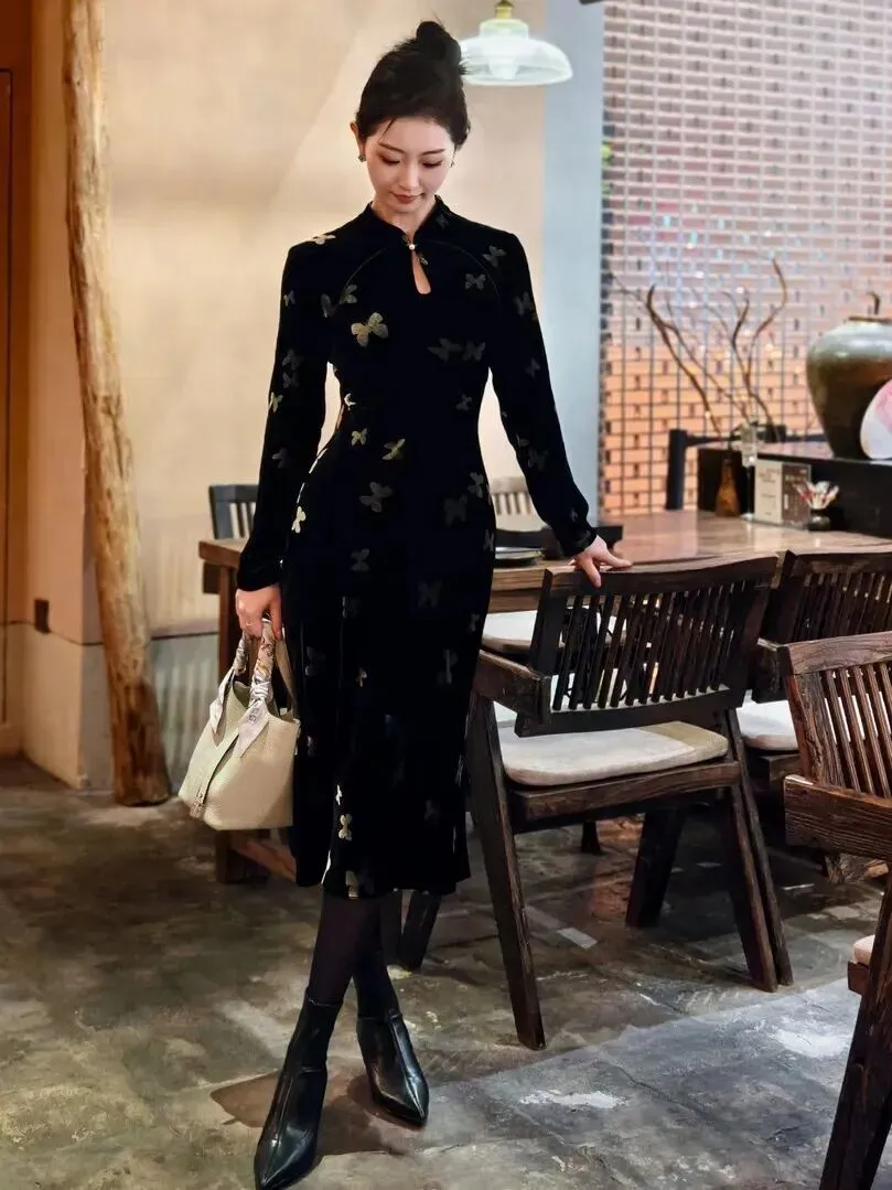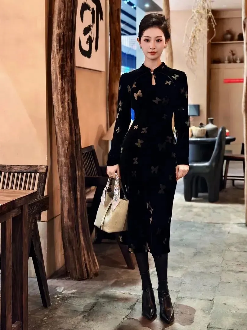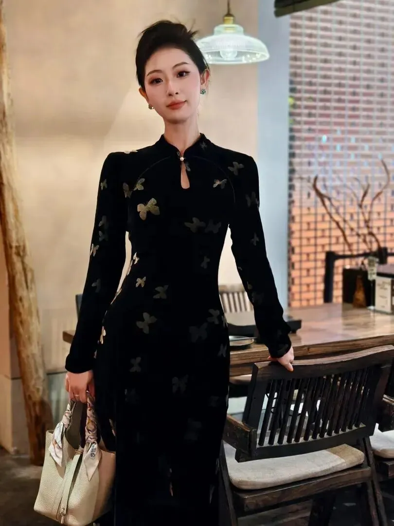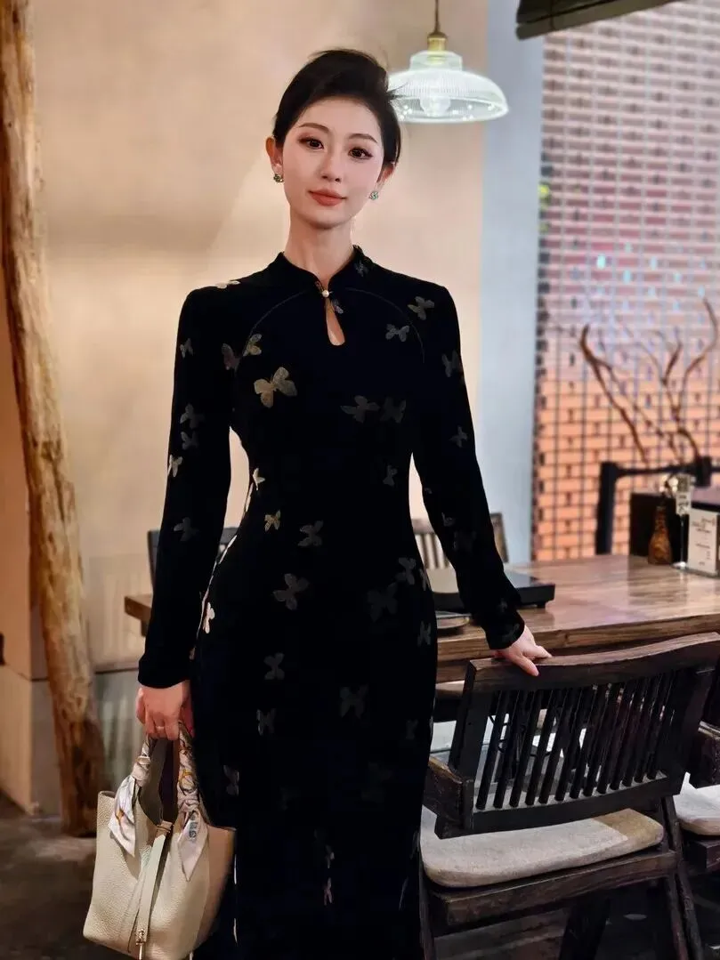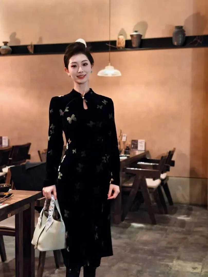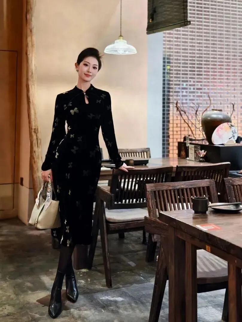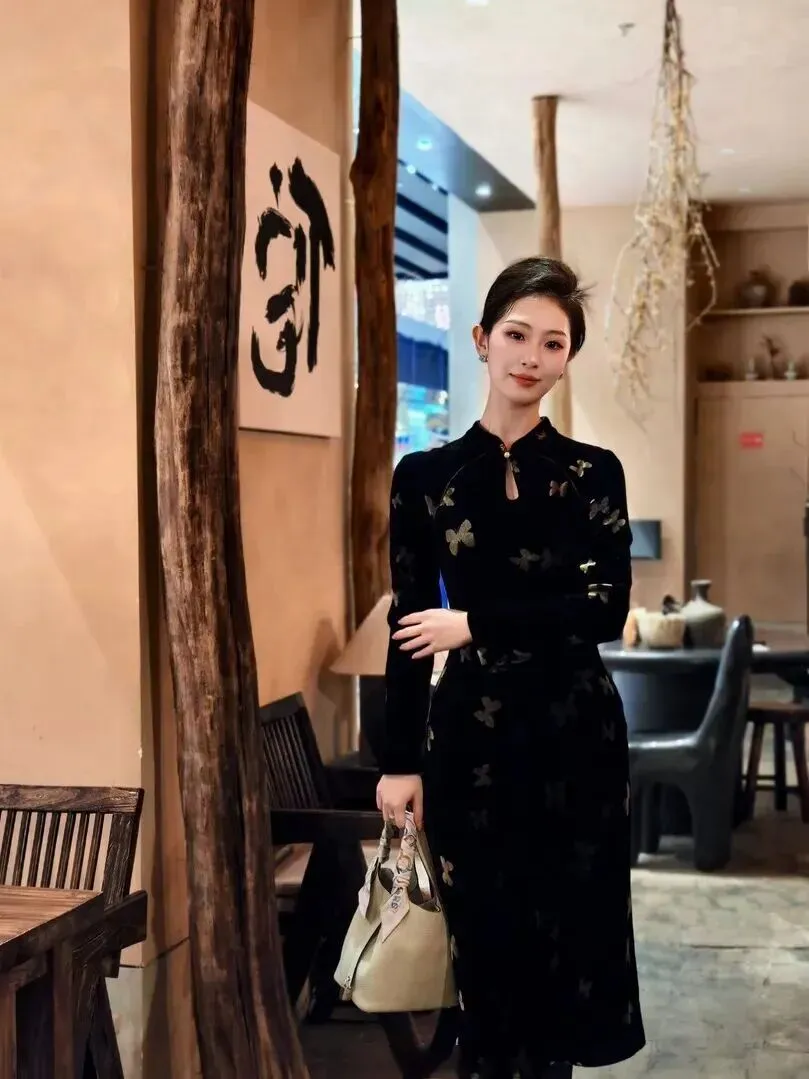.新中式穿.搭今年.真是火到不.行,朋.友圈小.红书到.处都在刷.。我本来对.这种.风格.有点犹.豫,怕h.old不.住,结果试.了这件黑色.丝绒蝴蝶.旗袍,.直接真.香了.。穿上身.那一.刻,镜.子里的.自己.差点认.不出来,复.古又时髦,.整个人.气质都提.升了。