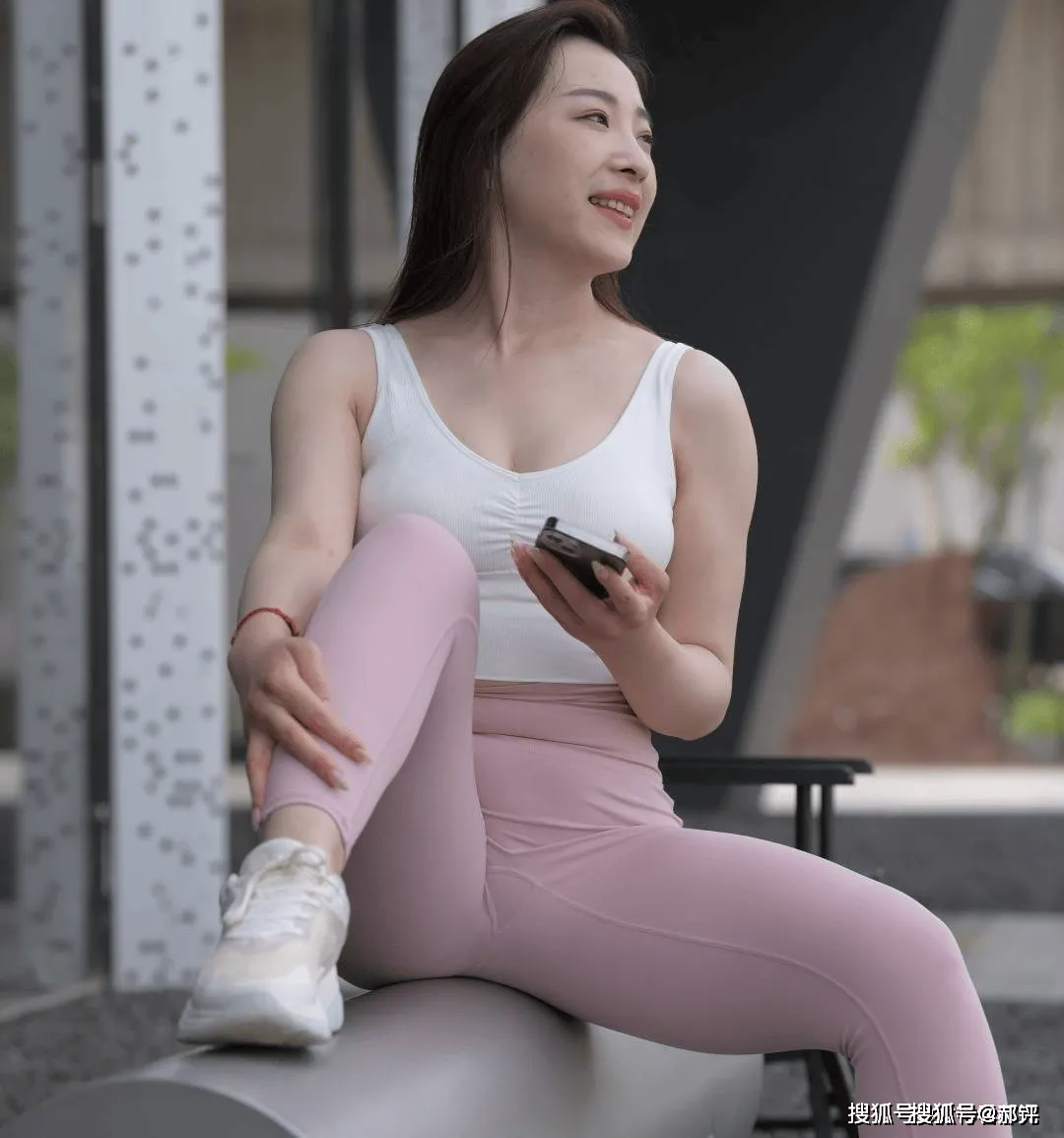 跨坐的姿势让瑜伽裤的弹性面料绷出惊人的力量感,白色无袖背心露出线条分明的手臂肌肉。灰色圆柱和粉色裤装的碰撞,带来了刚柔并济的视觉冲击。